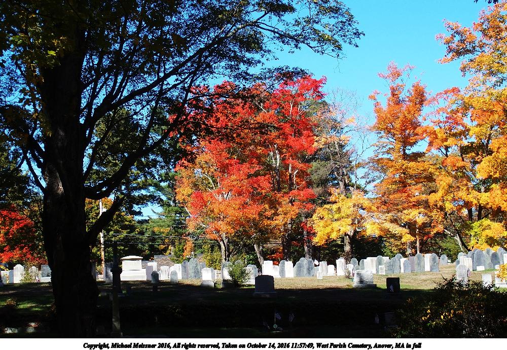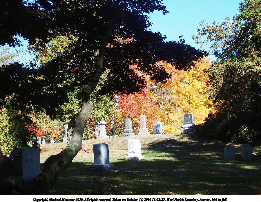 Picture #79: West Parish Cemetery, Anover, MA in fall #14 900x698, 209,543 bytes (205K), (html file) Copyright, Michael Meissner 2016, All rights reserved Olympus Stylus-1 camera f/2.8, ISO 100, 1/250 sec, 26.2mm, auto mode, vivid color, SHQ, matrix metering, IS Auto, noise reduction auto, noise filter low 35mm equivalent focal length 124.0mm Programs used: crop, raw therapee Taken by Michael Meissner on October 14, 2016 12:07:36 Last modified on October 26, 2016 at 00:28 |