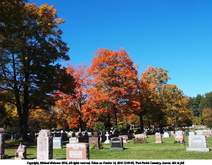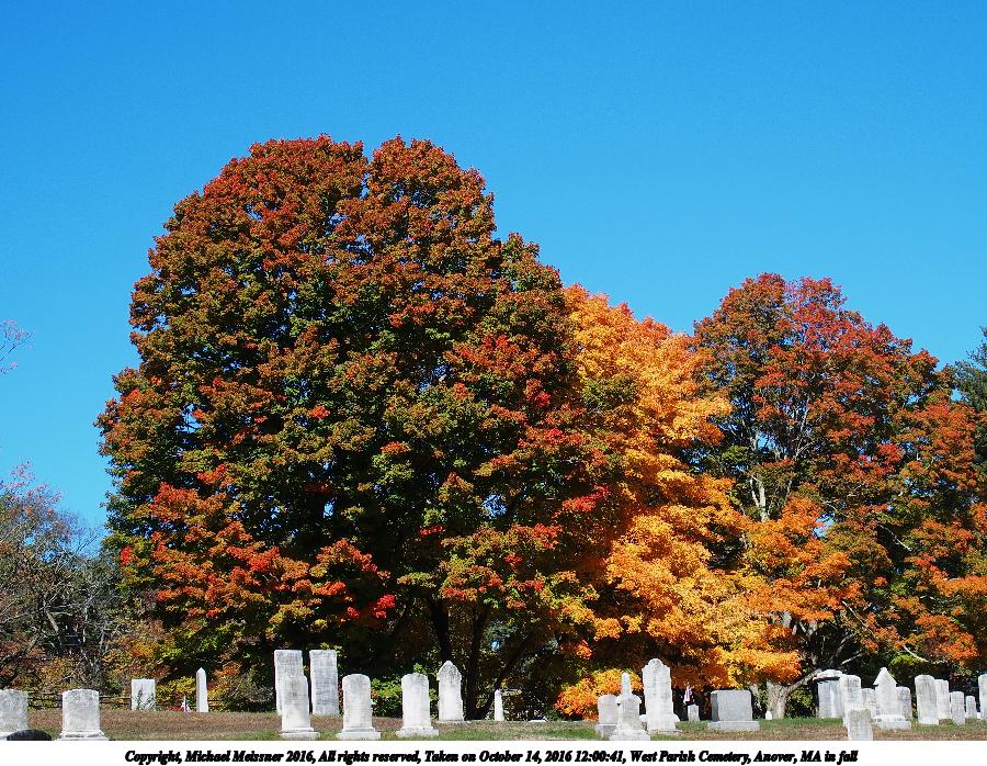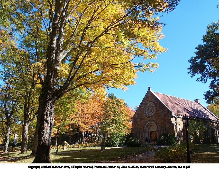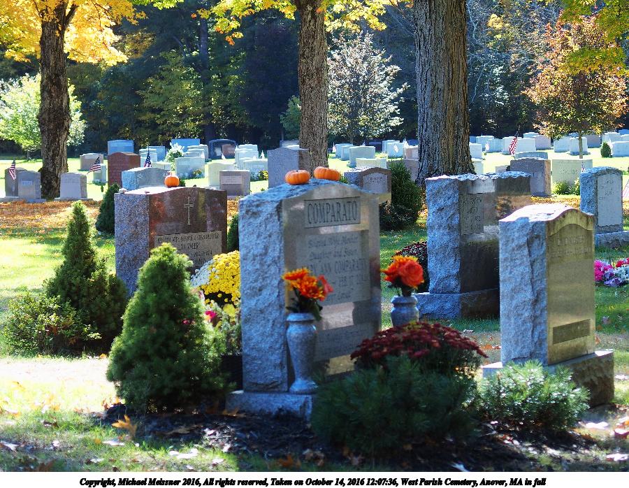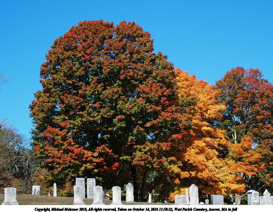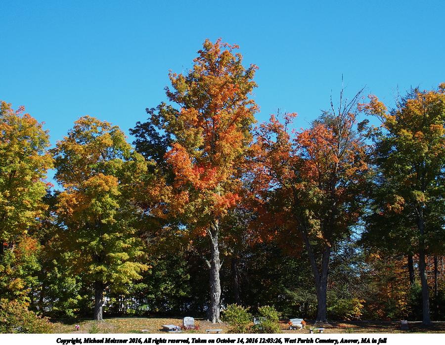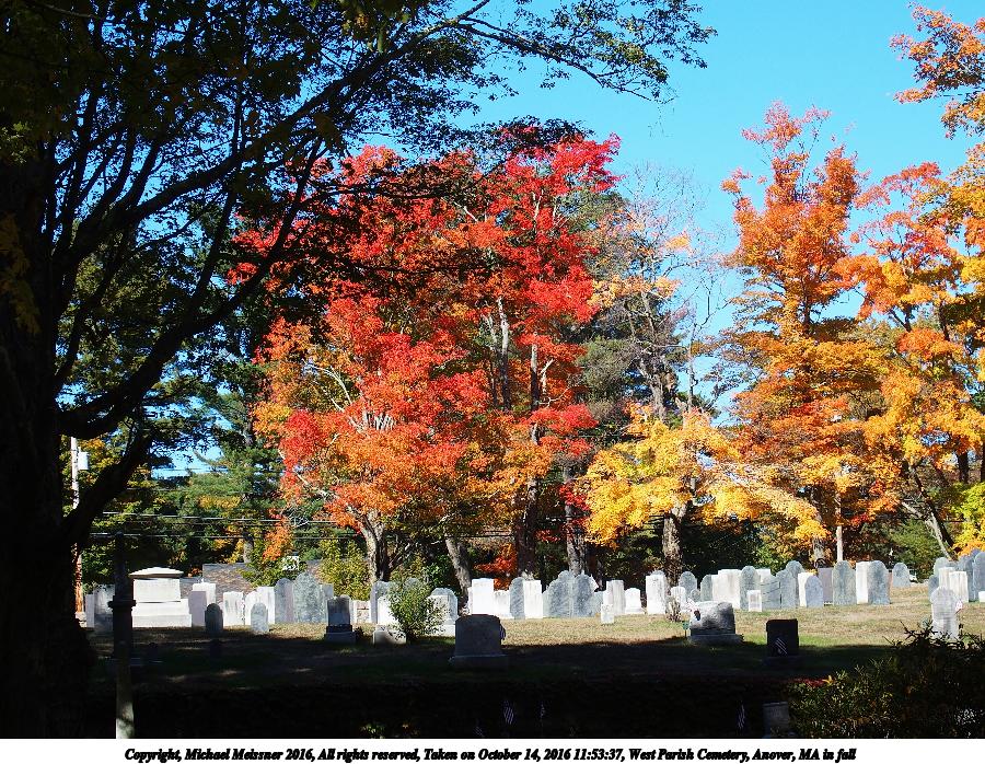 Picture #90: West Parish Cemetery, Anover, MA in fall #3 900x698, 254,893 bytes (249K), (html file) Copyright, Michael Meissner 2016, All rights reserved Olympus Stylus-1 camera f/3.5, ISO 100, 1/640 sec, 17.8mm, auto mode, vivid color, SHQ, matrix metering, IS Auto, noise reduction auto, noise filter low 35mm equivalent focal length 85.0mm Programs used: crop, raw therapee Taken by Michael Meissner on October 14, 2016 11:53:37 Last modified on October 26, 2016 at 00:14 |