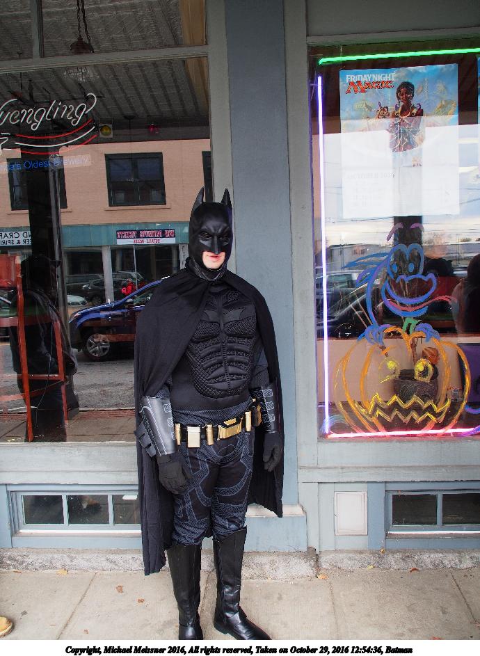 Picture #31: Batman 690x943, 134,263 bytes (132K), (html file) Copyright, Michael Meissner 2016, All rights reserved Olympus E-M5-I camera with Olympus-m43 14-150mm-II f/4.0-5.6 lens f/4.0, ISO 250, 1/60 sec, 14.0mm, auto mode, vivid color, matrix metering, IS1 (All Direction Shake IS), noise filter low 35mm equivalent focal length 28.0mm Programs used: crop, raw therapee, rotate left Taken by Michael Meissner on October 29, 2016 12:54:36 Last modified on October 29, 2016 at 18:32 |