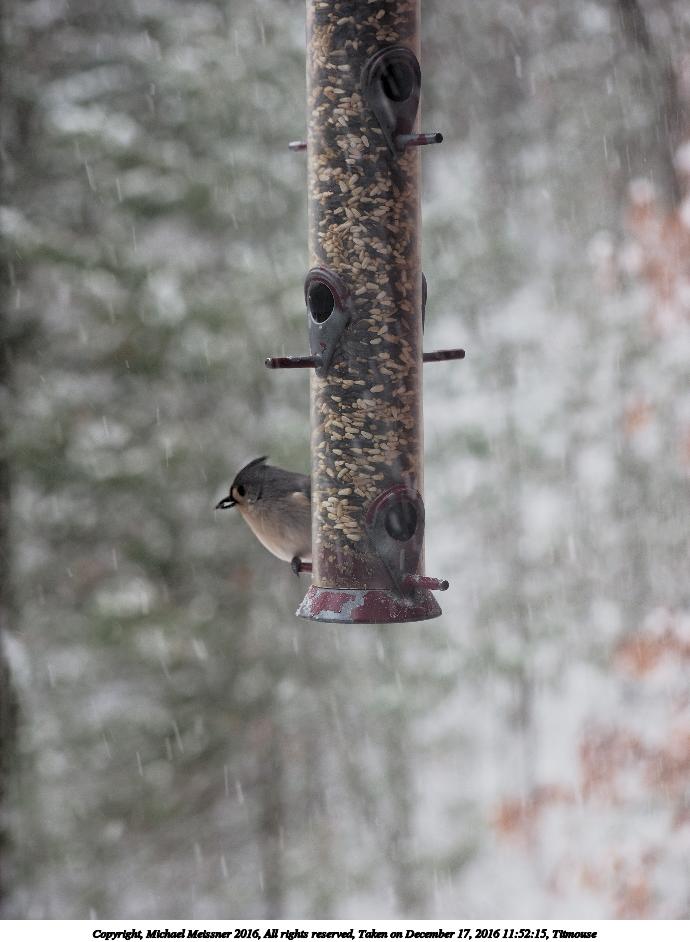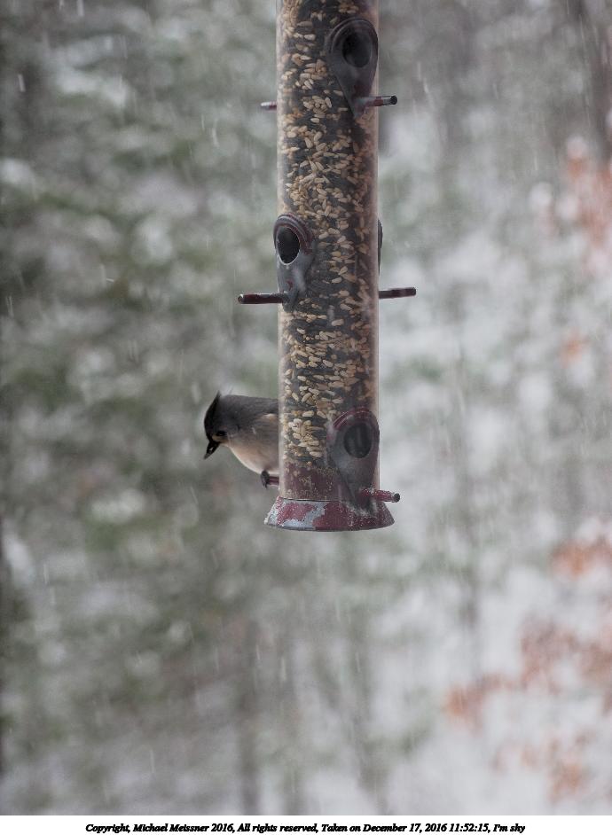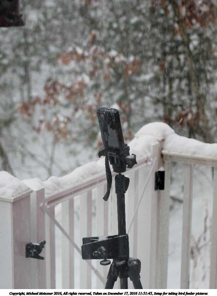 Picture #21: Setup for taking bird feeder pictures 690x942, 86,677 bytes (85K), (html file) Copyright, Michael Meissner 2016, All rights reserved Olympus E-M1-I camera with Olympus 50-200mm lens f/3.5, ISO 200, 1/200 sec, 50.0mm, auto mode, vivid color, SHQ, matrix metering, auto + manual focus, IS Auto, noise filter low, anti-shock 35mm equivalent focal length 100.0mm Programs used: crop, raw therapee, rotate left Taken by Michael Meissner on December 17, 2016 11:51:45 Last modified on December 17, 2016 at 13:11 |