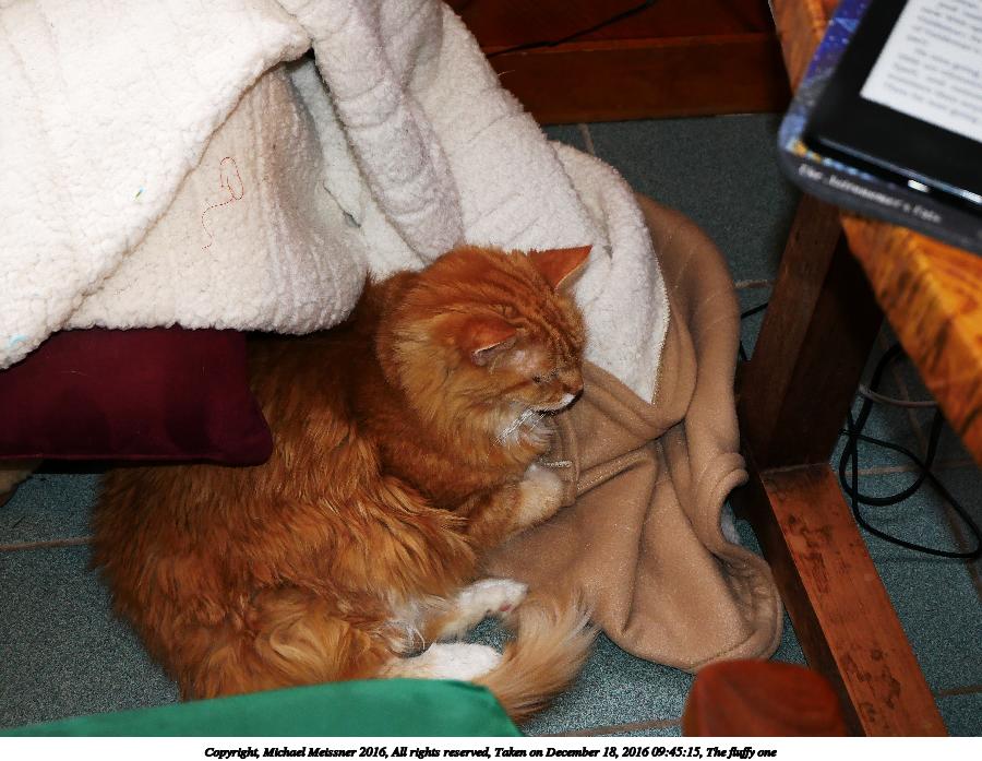 Picture #10: The fluffy one 900x697, 130,521 bytes (128K), (html file) Copyright, Michael Meissner 2016, All rights reserved Panasonic G85 camera with Panasonic 12-60mm f/3.5-5.6 lens f/5.1, ISO 800, flash, 1/60 sec, 33.0mm, auto mode, auto wb (5800), matrix metering 35mm equivalent focal length 66.0mm Programs used: crop, raw therapee Taken by Michael Meissner on December 18, 2016 09:45:15 Last modified on December 22, 2016 at 08:36 |