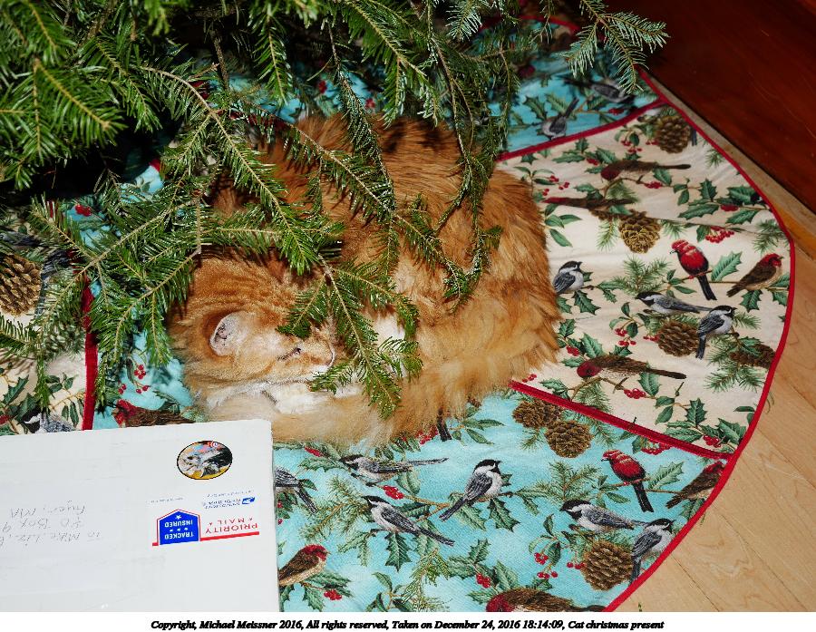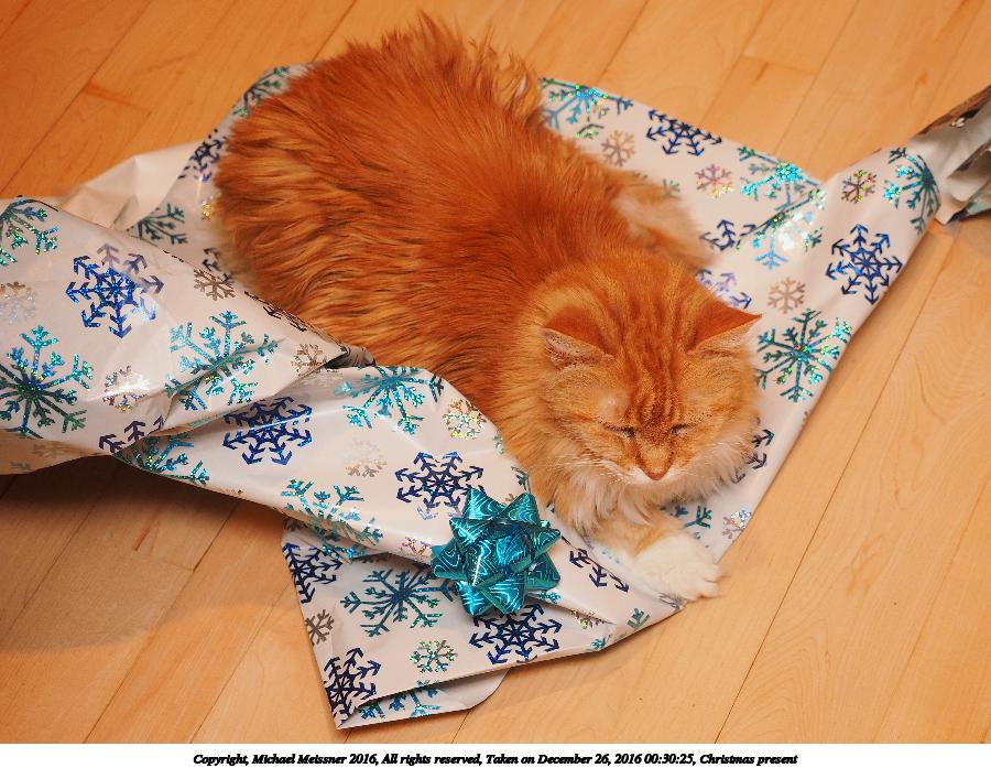 Picture #8: Cat christmas present 900x697, 219,508 bytes (215K), (html file) Copyright, Michael Meissner 2016, All rights reserved Panasonic G85 camera with Panasonic 12-60mm f/3.5-5.6 lens f/4.9, ISO 250, flash, 1/60 sec, 30.0mm, auto mode, auto wb (5700), matrix metering 35mm equivalent focal length 60.0mm Programs used: crop, raw therapee Taken by Michael Meissner on December 24, 2016 18:14:09 Last modified on December 26, 2016 at 10:57 |