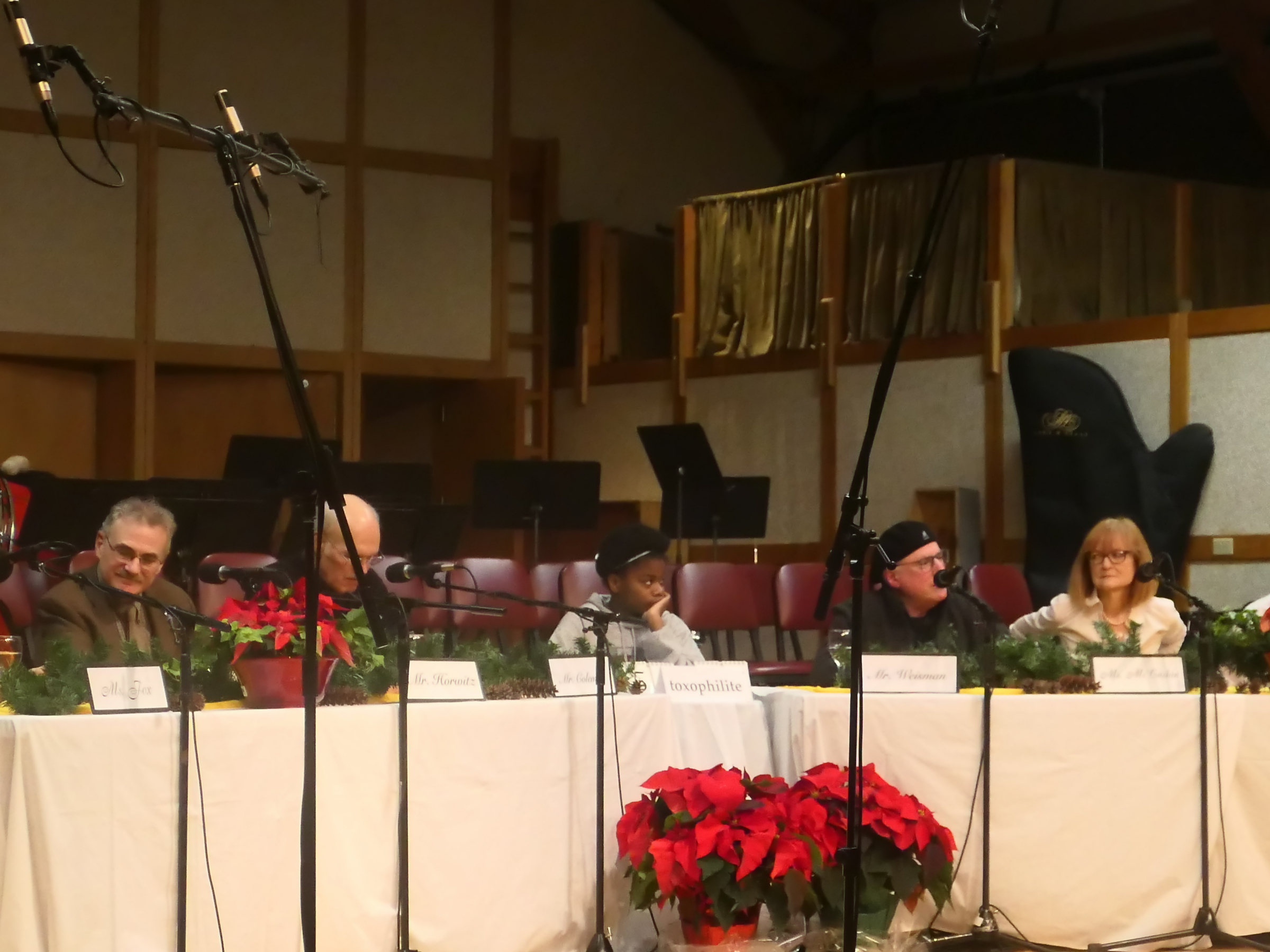 Picture #129: Says You radio show taping #7 Small: 900x698, 101,961 bytes (100K), (html file) Large: 3600x2700, 5,650,397 bytes (5.4M), (html file) Copyright, Michael Meissner 2017, All rights reserved Olympus Stylus-1 camera f/2.8, ISO 800, 1/60 sec, 35.0mm, auto mode, vivid color, SHQ, spot metering, IS Auto, noise reduction auto, noise filter low 35mm equivalent focal length 165.0mm Programs used: crop Taken by Michael Meissner on December 02, 2017 18:09:54 Last modified on April 25, 2018 at 10:04 |