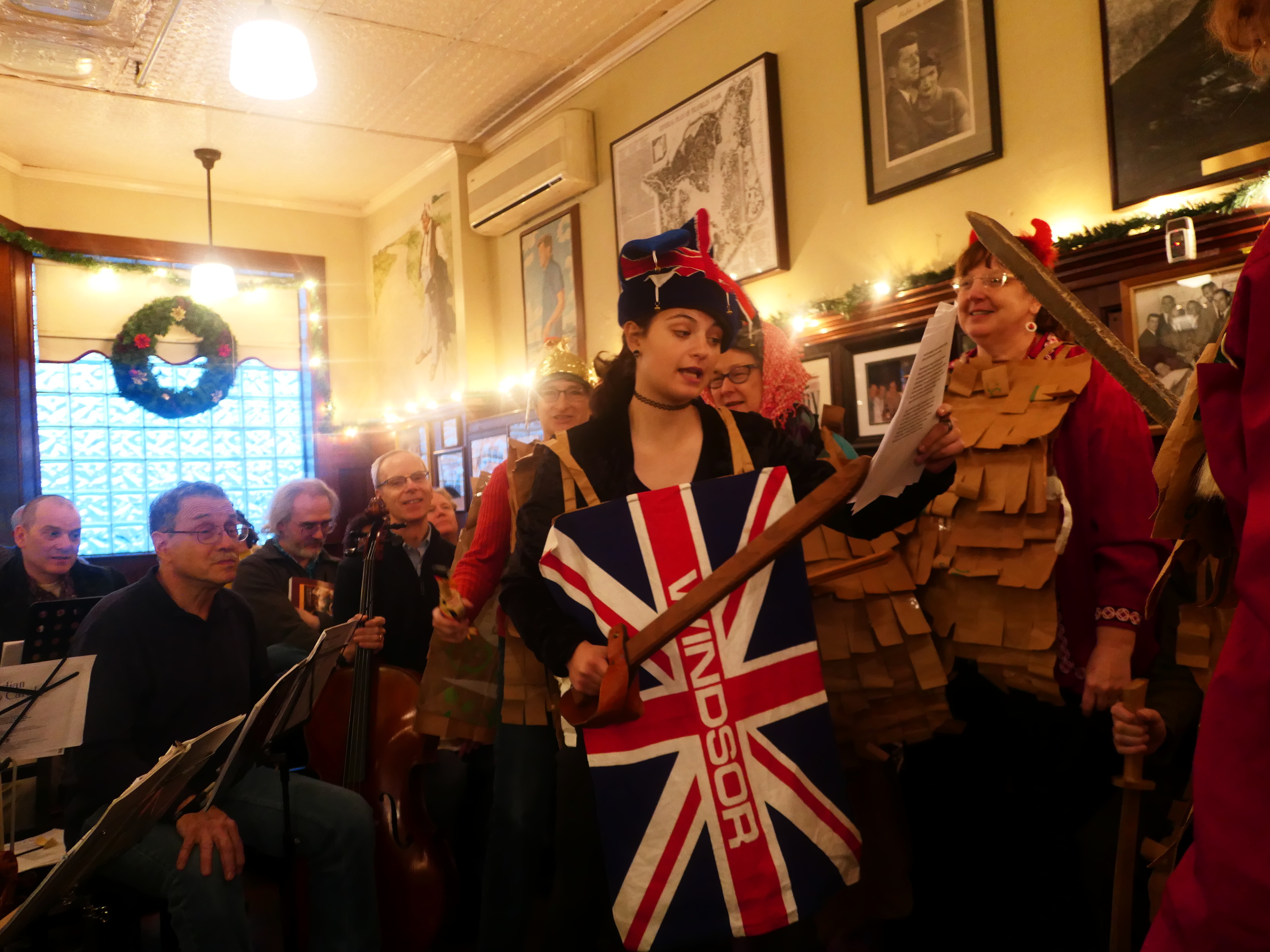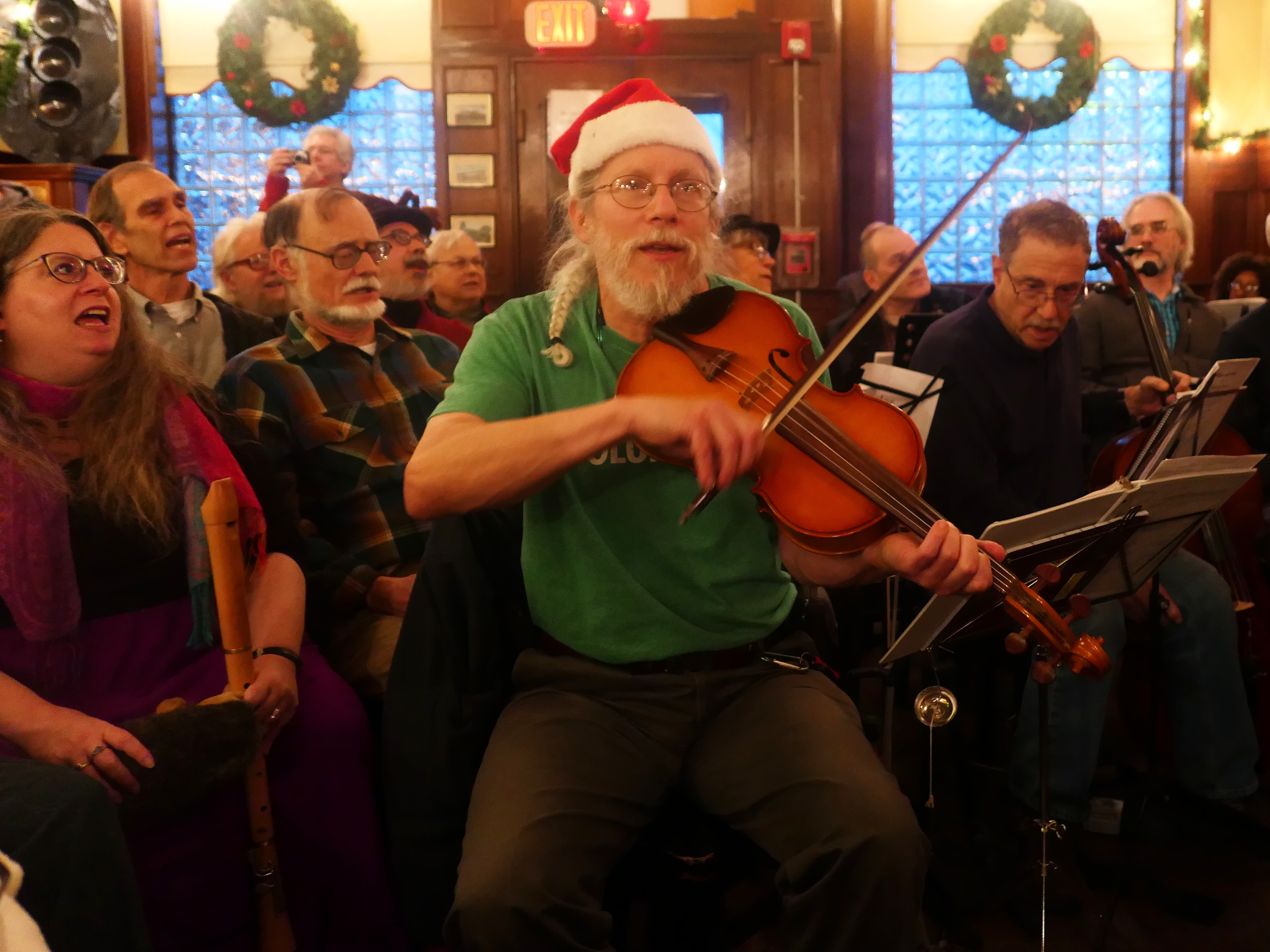 Picture #114: Christmas Pub Carol sing #3 Small: 960x743, 142,804 bytes (140K), (html file) Large: 4800x3600, 3,487,010 bytes (3.3M), (html file) Copyright, Michael Meissner 2017, All rights reserved Panasonic LX-10 camera f/1.4, ISO 640, 1/60 sec, 8.8mm, auto mode, auto wb (3200), matrix metering, image stabilization 35mm equivalent focal length 26.0mm Programs used: crop, raw therapee Taken by Michael Meissner on December 03, 2017 14:51:45 Last modified on April 25, 2018 at 10:05 |
