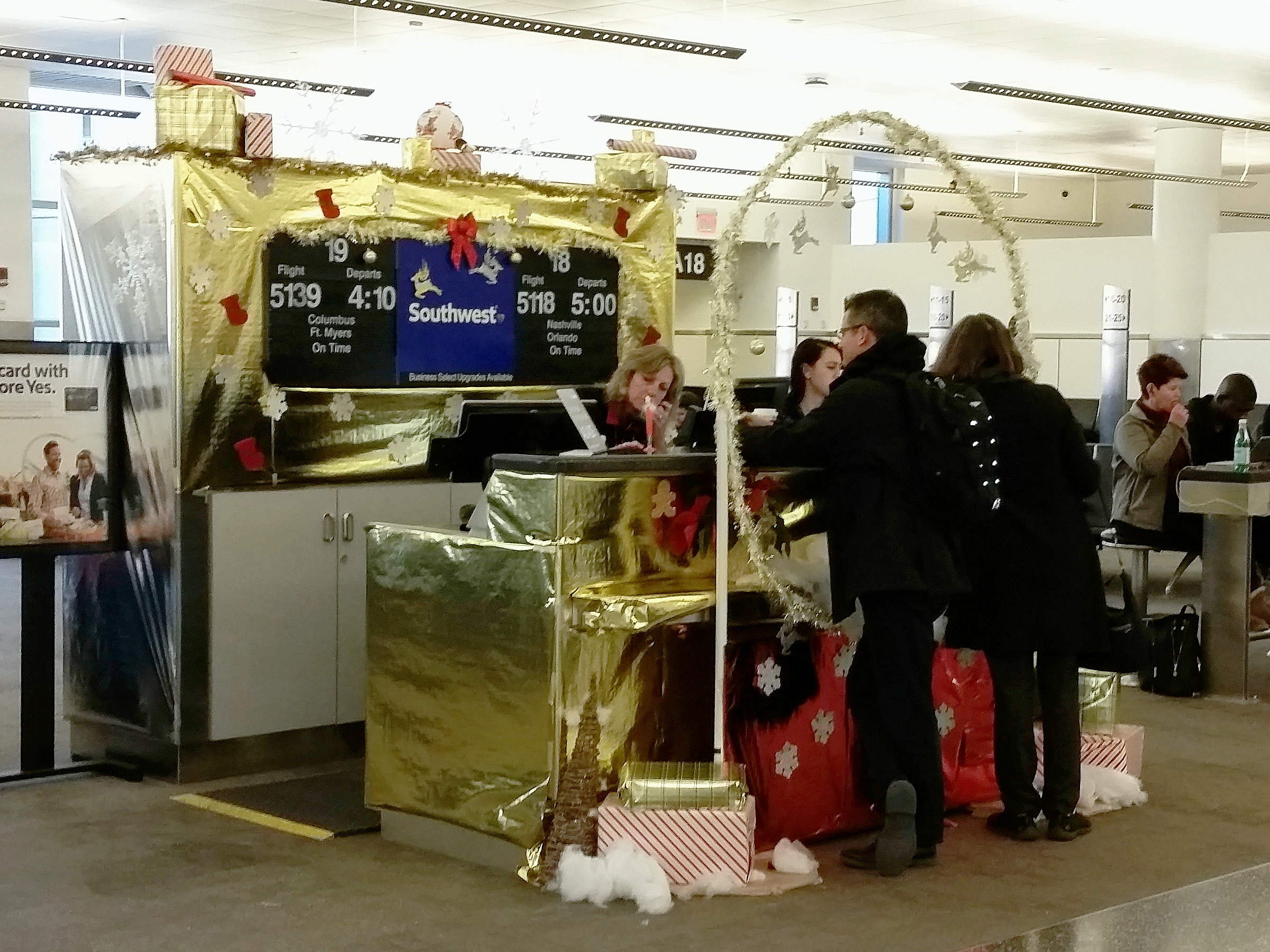 Picture #38: Southwest Airlines Christmas gate #2 Small: 1000x690, 135,355 bytes (133K), (html file) Large: 3000x2000, 4,538,324 bytes (4.3M), (html file) Copyright, Michael Meissner 2017, All rights reserved Samsung S5 phone f/2.2, ISO 200, flash, 1/30 sec, 4.8mm, auto mode, center weight metering 35mm equivalent focal length 31.0mm Programs used: gimp, raw therapee Taken by Michael Meissner on December 21, 2017 16:04:09 Last modified on April 25, 2018 at 10:04 |