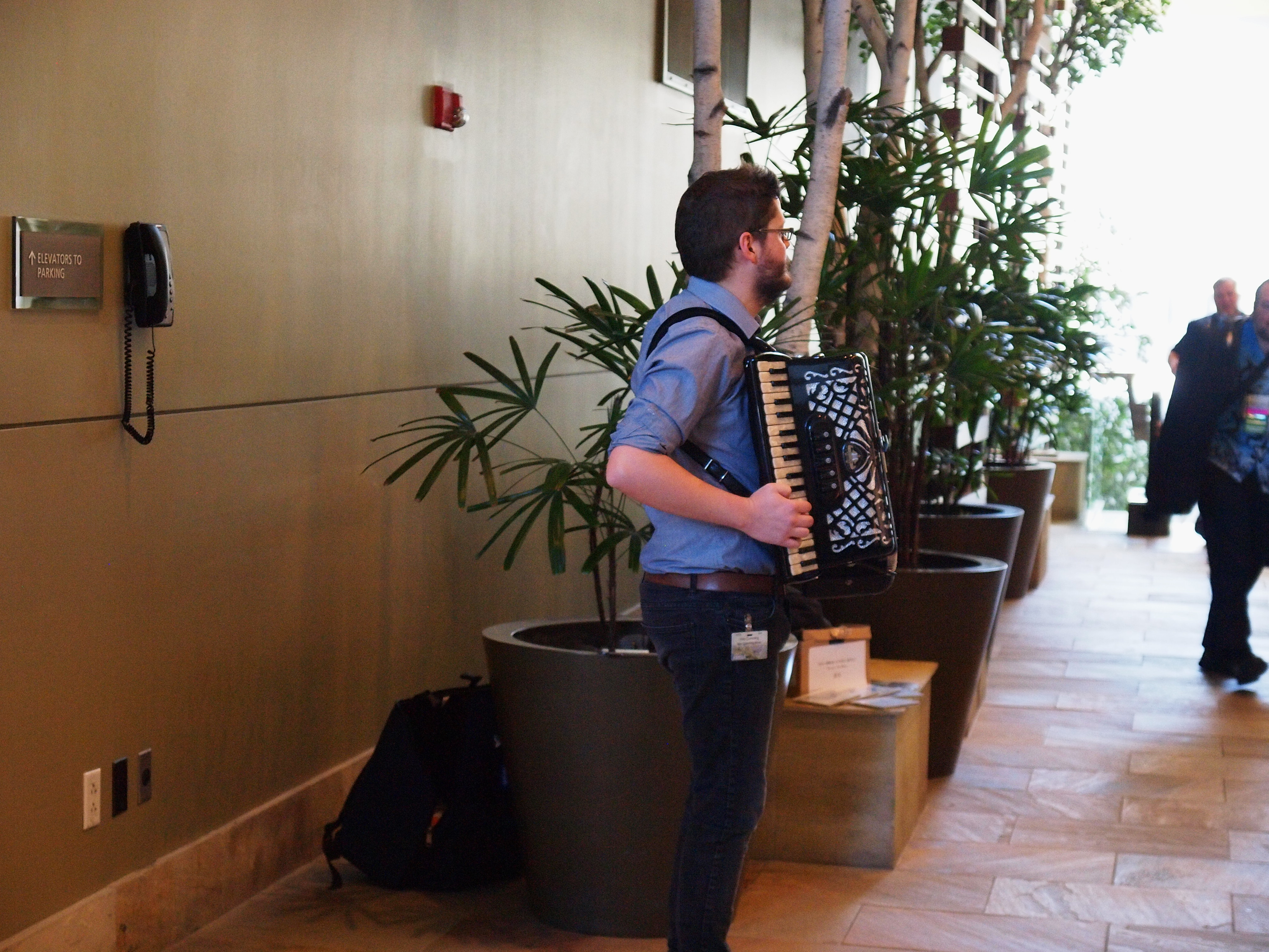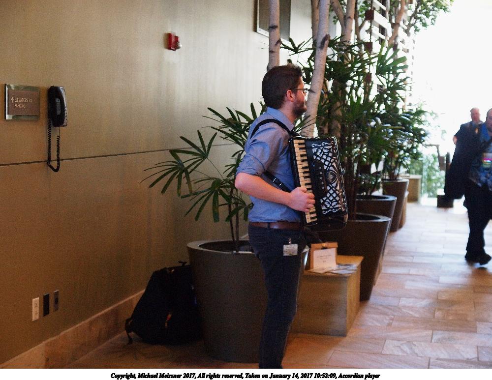 Picture #190: Accordian player Small: 1000x773, 137,029 bytes (134K), (html file) Large: 4000x3000, 7,743,481 bytes (7.4M), (html file) Copyright, Michael Meissner 2017, All rights reserved Olympus E-5 camera with Olympus 14-54mm f/2.8-3.5 lens f/3.2, ISO 1600, 1/80 sec, 33.0mm, auto mode, vivid color, HQ, matrix metering, IS1 (All Direction Shake IS), noise filter low 35mm equivalent focal length 66.0mm Programs used: crop, raw therapee Taken by Michael Meissner on January 14, 2017 10:52:09 Last modified on April 27, 2018 at 22:42 |