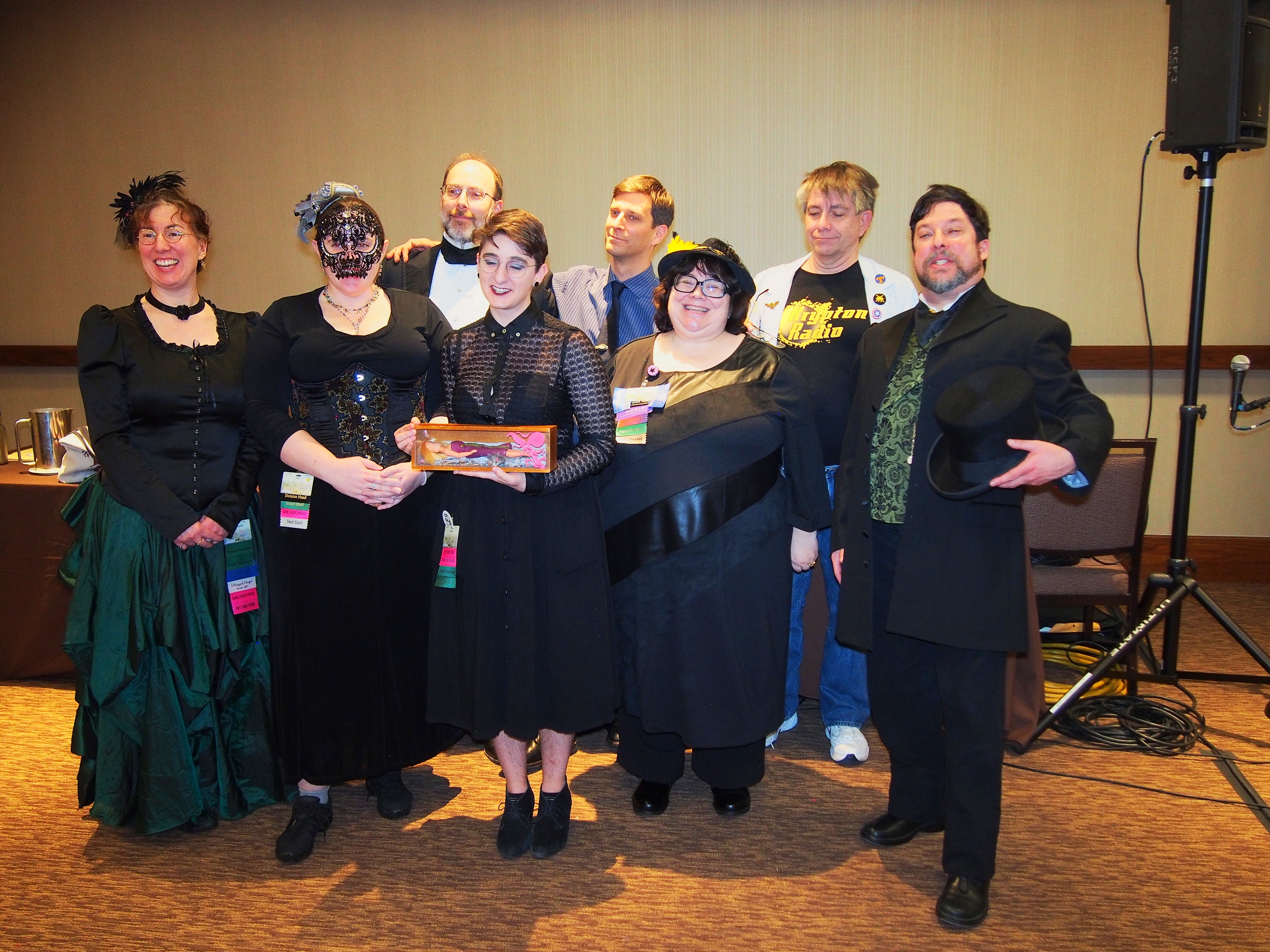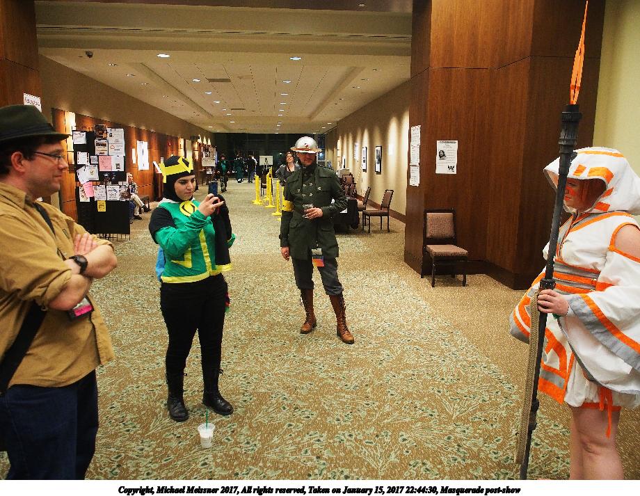 Picture #47: Masquerade post-show Small: 920x713, 166,488 bytes (163K), (html file) Large: 4600x3450, 7,774,932 bytes (7.4M), (html file) Copyright, Michael Meissner 2017, All rights reserved Olympus E-M5-I camera with Olympus-m43 12-40mm f/2.8 lens f/2.8, ISO 800, FL-36R flash (+0.33 flash compensation), 1/60 sec, 12.0mm, auto mode, vivid color, matrix metering, IS1 (All Direction Shake IS), noise filter low 35mm equivalent focal length 24.0mm Programs used: crop, raw therapee Taken by Michael Meissner on January 15, 2017 22:00:09 Last modified on April 27, 2018 at 22:51 |