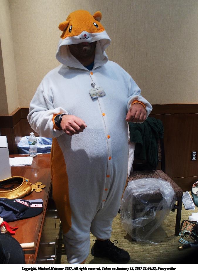 Picture #191: Furry critter Small: 675x923, 110,628 bytes (109K), (html file) Large: 2700x3600, 5,651,952 bytes (5.4M), (html file) Copyright, Michael Meissner 2017, All rights reserved Olympus Stylus-1 camera f/2.8, ISO 200, 1/50 sec, 6.0mm, auto mode, vivid color, SHQ, matrix metering, IS Auto, noise reduction auto, noise filter low 35mm equivalent focal length 28.0mm Programs used: crop Taken by Michael Meissner on January 13, 2017 22:34:32 Last modified on April 27, 2018 at 22:42 |