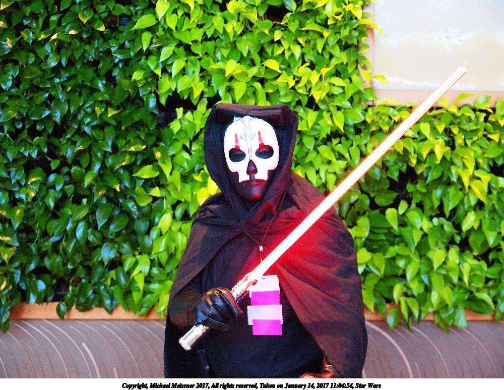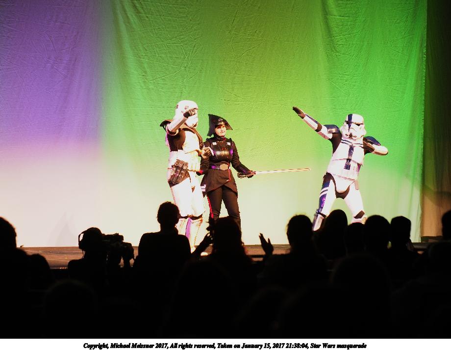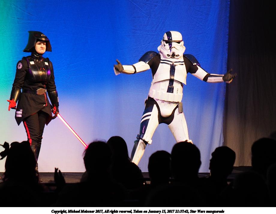 Picture #74: Star Wars masquerade #2 Small: 920x713, 90,288 bytes (89K), (html file) Large: 4600x3450, 3,638,965 bytes (3.5M), (html file) Copyright, Michael Meissner 2017, All rights reserved Olympus E-M1-I camera with Olympus 50-200mm lens f/2.8, ISO 320, 1/125 sec, 59.0mm, auto mode, vivid color, SHQ, spot metering, bias 0.3, digital zoom x2, IS Auto, noise filter low, anti-shock 35mm equivalent focal length 236.0mm, digital zoom x2 Programs used: crop, raw therapee Taken by Michael Meissner on January 15, 2017 21:37:42 Last modified on April 27, 2018 at 22:49 |