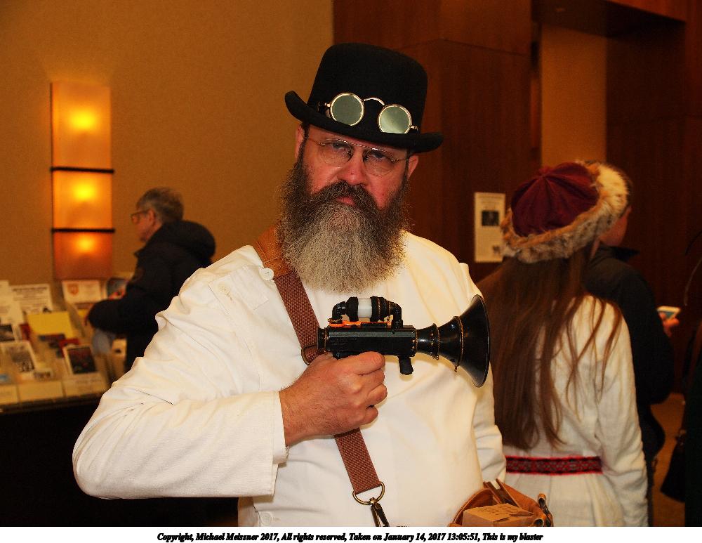 Picture #182: This is my blaster Small: 1000x773, 108,567 bytes (107K), (html file) Large: 4000x3000, 6,902,222 bytes (6.6M), (html file) Copyright, Michael Meissner 2017, All rights reserved Olympus E-5 camera with Olympus 14-54mm f/2.8-3.5 lens f/3.0, ISO 250, flash, 1/60 sec, 23.0mm, auto mode, vivid color, HQ, matrix metering, IS1 (All Direction Shake IS), noise filter low 35mm equivalent focal length 46.0mm Programs used: crop, raw therapee Taken by Michael Meissner on January 14, 2017 13:05:51 Last modified on April 27, 2018 at 22:42 |