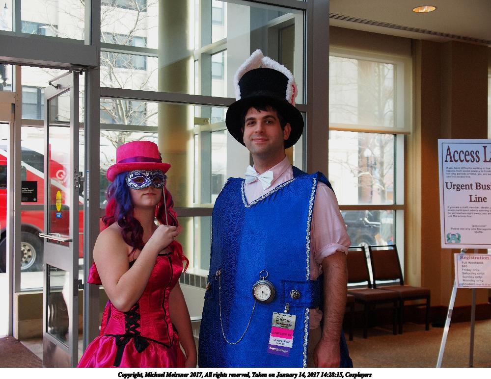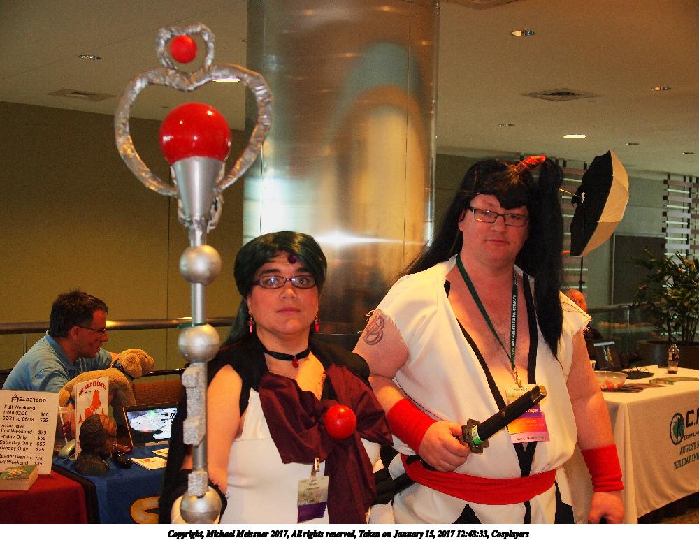 Picture #179: Cosplayers Small: 1000x773, 145,825 bytes (143K), (html file) Large: 4000x3000, 7,214,585 bytes (6.9M), (html file) Copyright, Michael Meissner 2017, All rights reserved Olympus E-5 camera with Olympus 14-54mm f/2.8-3.5 lens f/3.0, ISO 250, flash, 1/60 sec, 23.0mm, auto mode, vivid color, HQ, matrix metering, IS1 (All Direction Shake IS), noise filter low 35mm equivalent focal length 46.0mm Programs used: crop Taken by Michael Meissner on January 14, 2017 14:28:15 Last modified on April 27, 2018 at 22:43 |