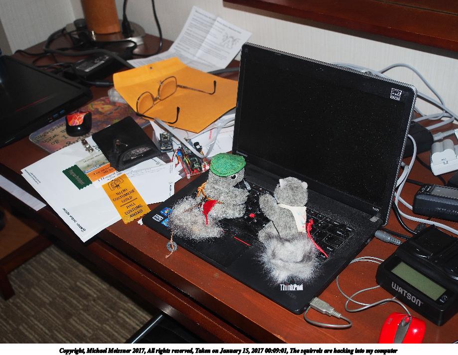 Picture #178: The squirrels are hacking into my computer Small: 920x713, 128,092 bytes (126K), (html file) Large: 4600x3450, 9,327,984 bytes (8.9M), (html file) Copyright, Michael Meissner 2017, All rights reserved Olympus E-M5-I camera with Olympus-m43 12-40mm f/2.8 lens f/2.8, ISO 200, flash (+0.33 flash compensation), 1/60 sec, 21.0mm, auto mode, vivid color, matrix metering, IS1 (All Direction Shake IS), noise filter low 35mm equivalent focal length 42.0mm Programs used: crop, raw therapee Taken by Michael Meissner on January 15, 2017 00:09:01 Last modified on April 27, 2018 at 22:44 |
