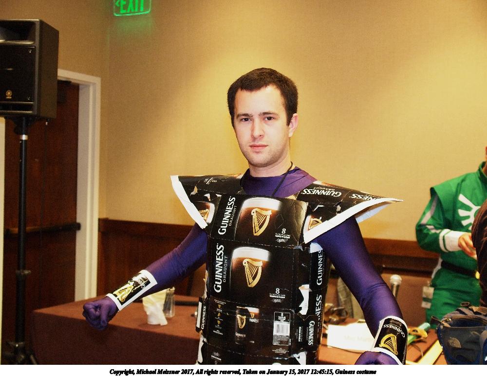 Picture #177: Guiness costume Small: 1000x773, 127,195 bytes (125K), (html file) Large: 4000x3000, 7,440,185 bytes (7.1M), (html file) Copyright, Michael Meissner 2017, All rights reserved Olympus E-5 camera with Olympus 14-54mm f/2.8-3.5 lens f/3.0, ISO 1250, flash, 1/60 sec, 23.0mm, auto mode, vivid color, HQ, matrix metering, IS1 (All Direction Shake IS), noise filter low 35mm equivalent focal length 46.0mm Programs used: crop, raw therapee Taken by Michael Meissner on January 15, 2017 12:45:15 Last modified on April 27, 2018 at 22:43 |