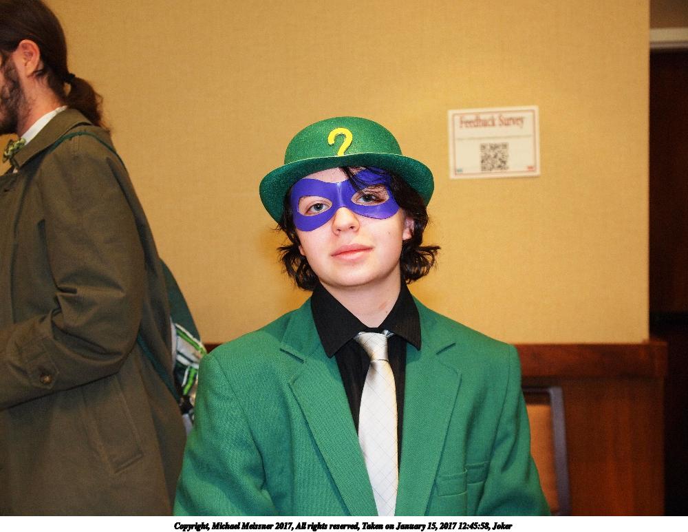 Picture #176: Joker Small: 1000x773, 104,841 bytes (103K), (html file) Large: 4000x3000, 6,718,577 bytes (6.4M), (html file) Copyright, Michael Meissner 2017, All rights reserved Olympus E-5 camera with Olympus 14-54mm f/2.8-3.5 lens f/3.0, ISO 640, flash, 1/60 sec, 23.0mm, auto mode, vivid color, HQ, matrix metering, IS1 (All Direction Shake IS), noise filter low 35mm equivalent focal length 46.0mm Programs used: crop, raw therapee Taken by Michael Meissner on January 15, 2017 12:45:58 Last modified on April 27, 2018 at 22:43 |