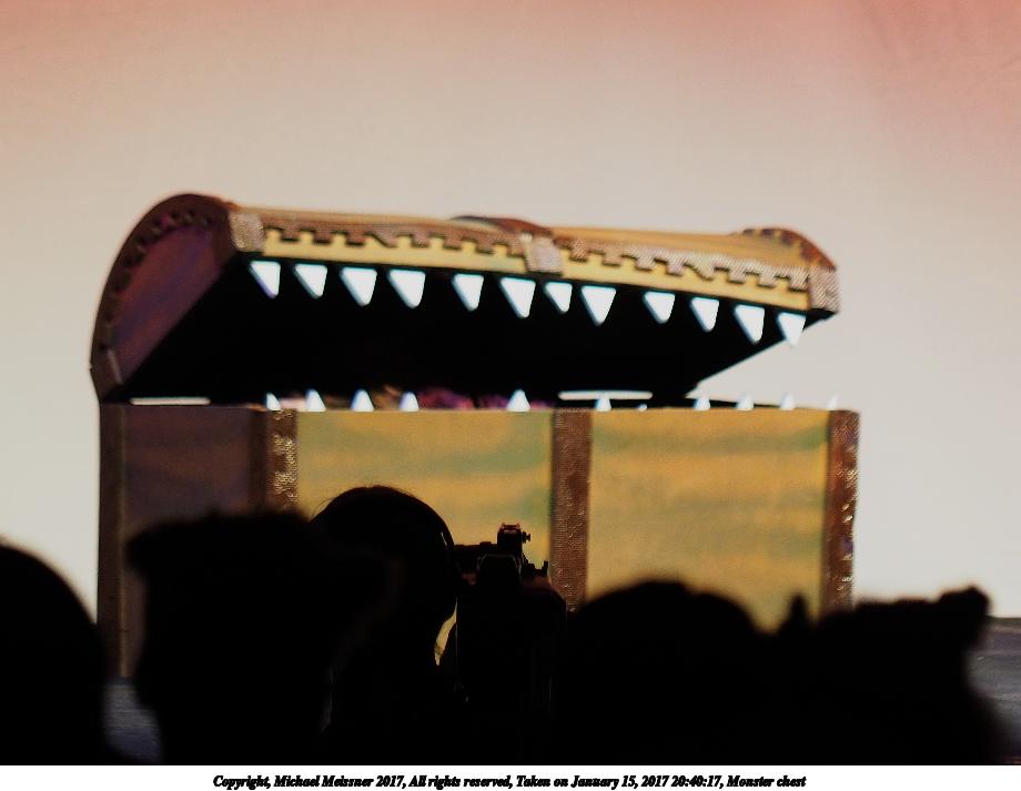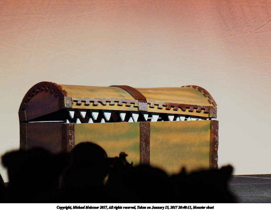 Picture #161: Monster chest Small: 920x713, 71,353 bytes (70K), (html file) Large: 4600x3450, 5,036,341 bytes (4.8M), (html file) Copyright, Michael Meissner 2017, All rights reserved Olympus E-M1-I camera with Olympus 50-200mm lens f/2.9, ISO 640, 1/200 sec, 112.0mm, auto mode, vivid color, SHQ, center weight metering, bias -0.7, digital zoom x2, IS Auto, noise filter low, anti-shock 35mm equivalent focal length 449.0mm, digital zoom x2 Programs used: crop, raw therapee Taken by Michael Meissner on January 15, 2017 20:40:11 Last modified on April 27, 2018 at 22:45 |