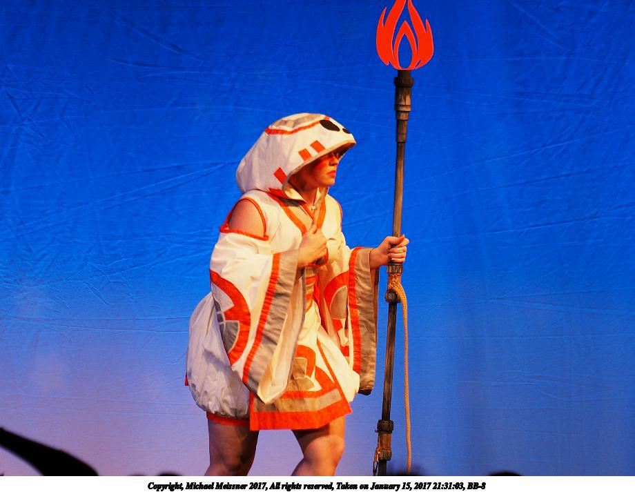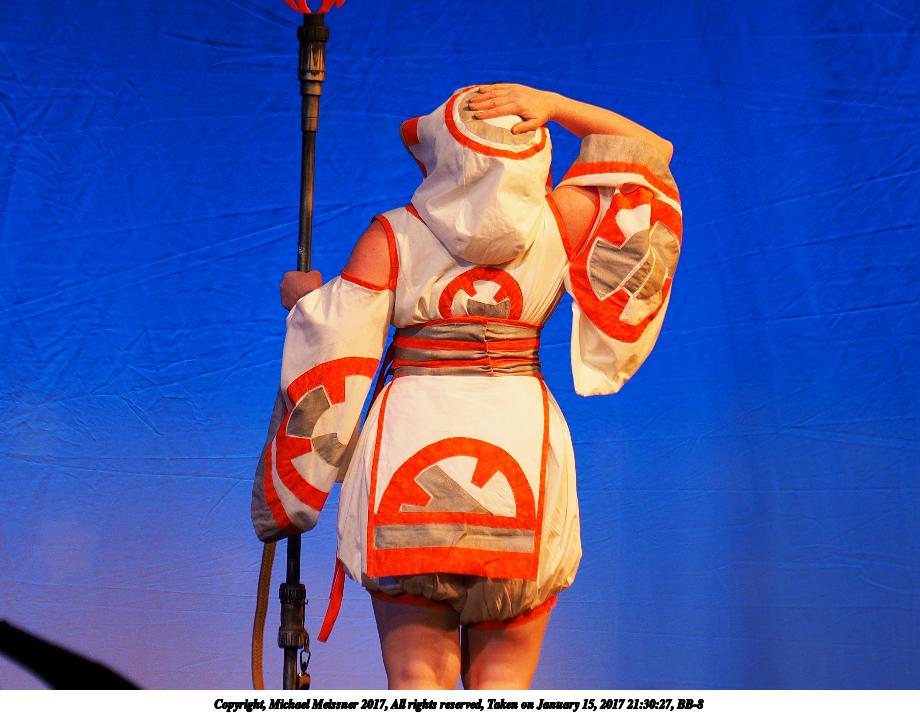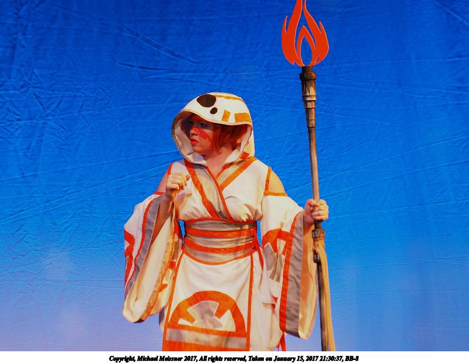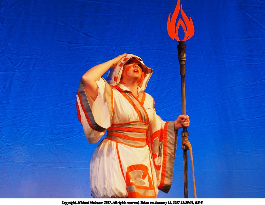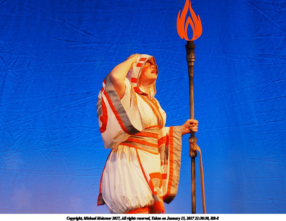 Picture #99: BB-8 Small: 920x713, 99,816 bytes (98K), (html file) Large: 4600x3450, 7,832,166 bytes (7.5M), (html file) Copyright, Michael Meissner 2017, All rights reserved Olympus E-M1-I camera with Olympus 50-200mm lens f/3.2, ISO 200, 1/250 sec, 101.0mm, auto mode, vivid color, SHQ, spot metering, bias 0.3, digital zoom x2, IS Auto, noise filter low, anti-shock 35mm equivalent focal length 405.0mm, digital zoom x2 Programs used: crop, raw therapee Taken by Michael Meissner on January 15, 2017 21:30:27 Last modified on April 27, 2018 at 22:48 |