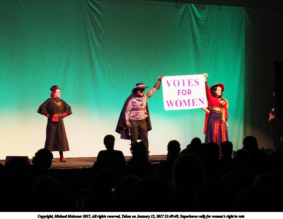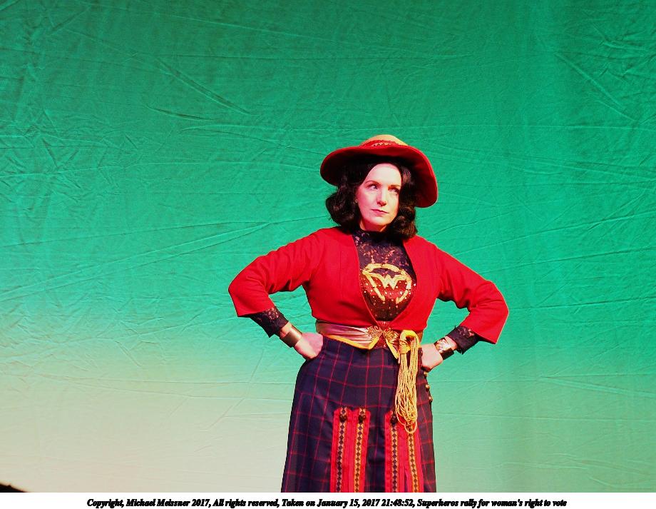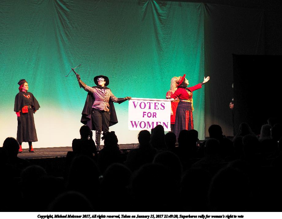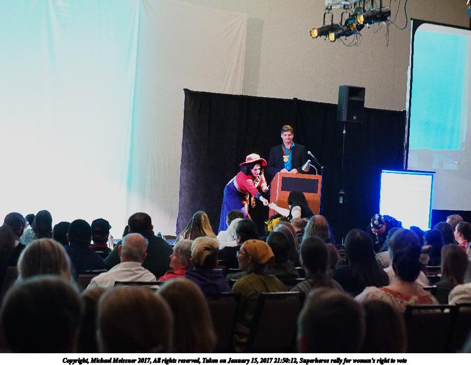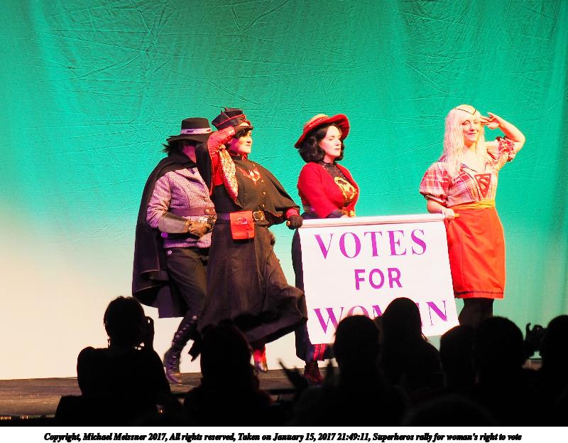 Picture #50: Superheros rally for woman's right to vote #4 Small: 920x713, 92,614 bytes (91K), (html file) Large: 4600x3450, 4,423,578 bytes (4.2M), (html file) Copyright, Michael Meissner 2017, All rights reserved Olympus E-M1-I camera with Olympus 50-200mm lens f/4.0, ISO 250, 1/125 sec, 50.0mm, auto mode, vivid color, SHQ, spot metering, IS Auto, noise filter low, anti-shock 35mm equivalent focal length 100.0mm Programs used: crop, raw therapee Taken by Michael Meissner on January 15, 2017 21:49:20 Last modified on April 27, 2018 at 22:51 |