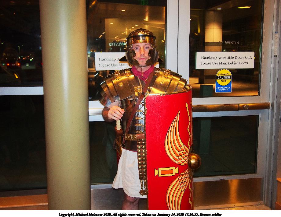 Picture #23: Roman soldier Small: 920x713, 122,769 bytes (120K), (html file) Large: 4600x3450, 6,043,209 bytes (5.8M), (html file) Copyright, Michael Meissner 2018, All rights reserved Olympus E-PM2 camera with Olympus-m43 14-42mm-IIR f/3.5-5.6 lens f/4.0, ISO 800, flash (+0.33 flash compensation), 1/60 sec, 20.0mm, auto mode, vivid color, matrix metering, IS1 (All Direction Shake IS), noise filter low 35mm equivalent focal length 40.0mm Programs used: crop, raw therapee Taken by Michael Meissner on January 14, 2018 17:16:35 Last modified on April 27, 2018 at 22:44 |