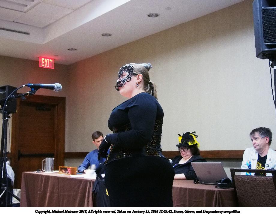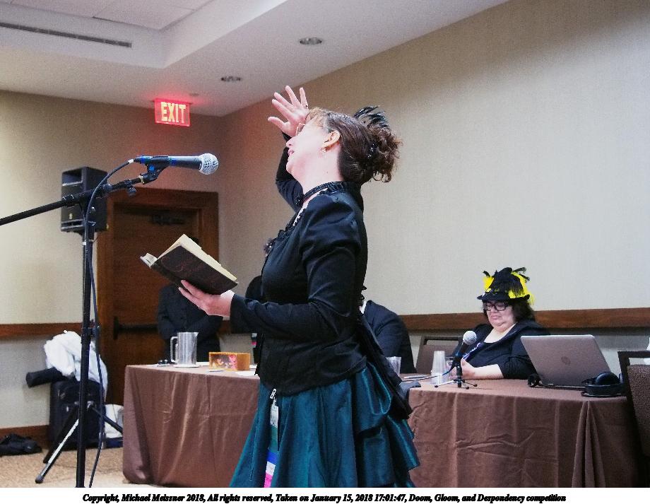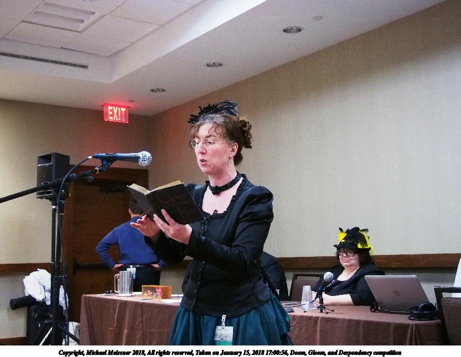 Picture #5: Doom, Gloom, and Despondency competition #9 Small: 920x713, 146,660 bytes (144K), (html file) Large: 4600x3450, 7,139,668 bytes (6.8M), (html file) Copyright, Michael Meissner 2018, All rights reserved Olympus E-PM2 camera with Olympus-m43 14-42mm-IIR f/3.5-5.6 lens f/3.6, ISO 800, flash (+0.33 flash compensation), 1/60 sec, 16.0mm, auto mode, vivid color, matrix metering, IS1 (All Direction Shake IS), noise filter low 35mm equivalent focal length 32.0mm Programs used: crop, raw therapee Taken by Michael Meissner on January 15, 2018 17:17:06 Last modified on April 27, 2018 at 22:52 |