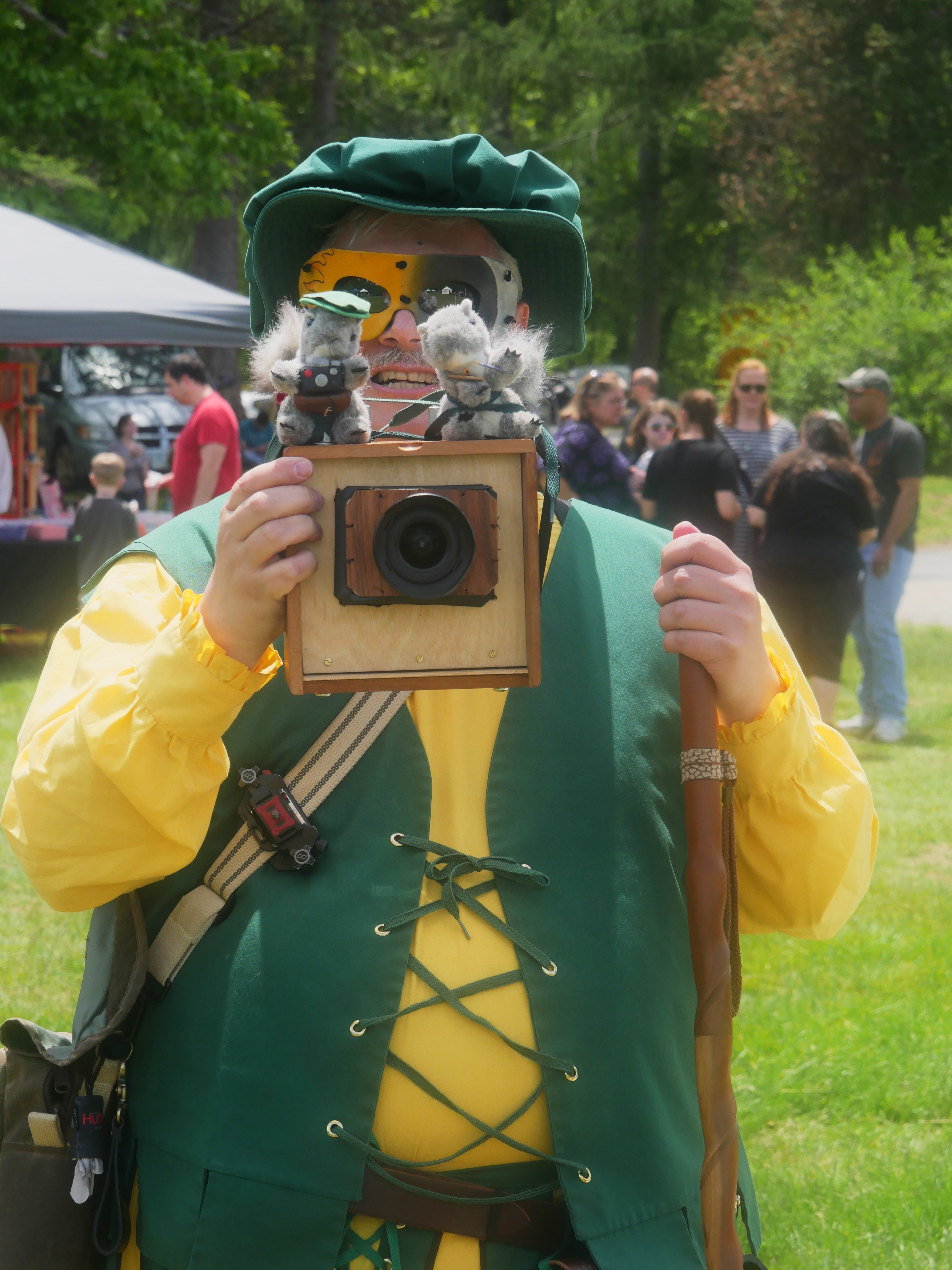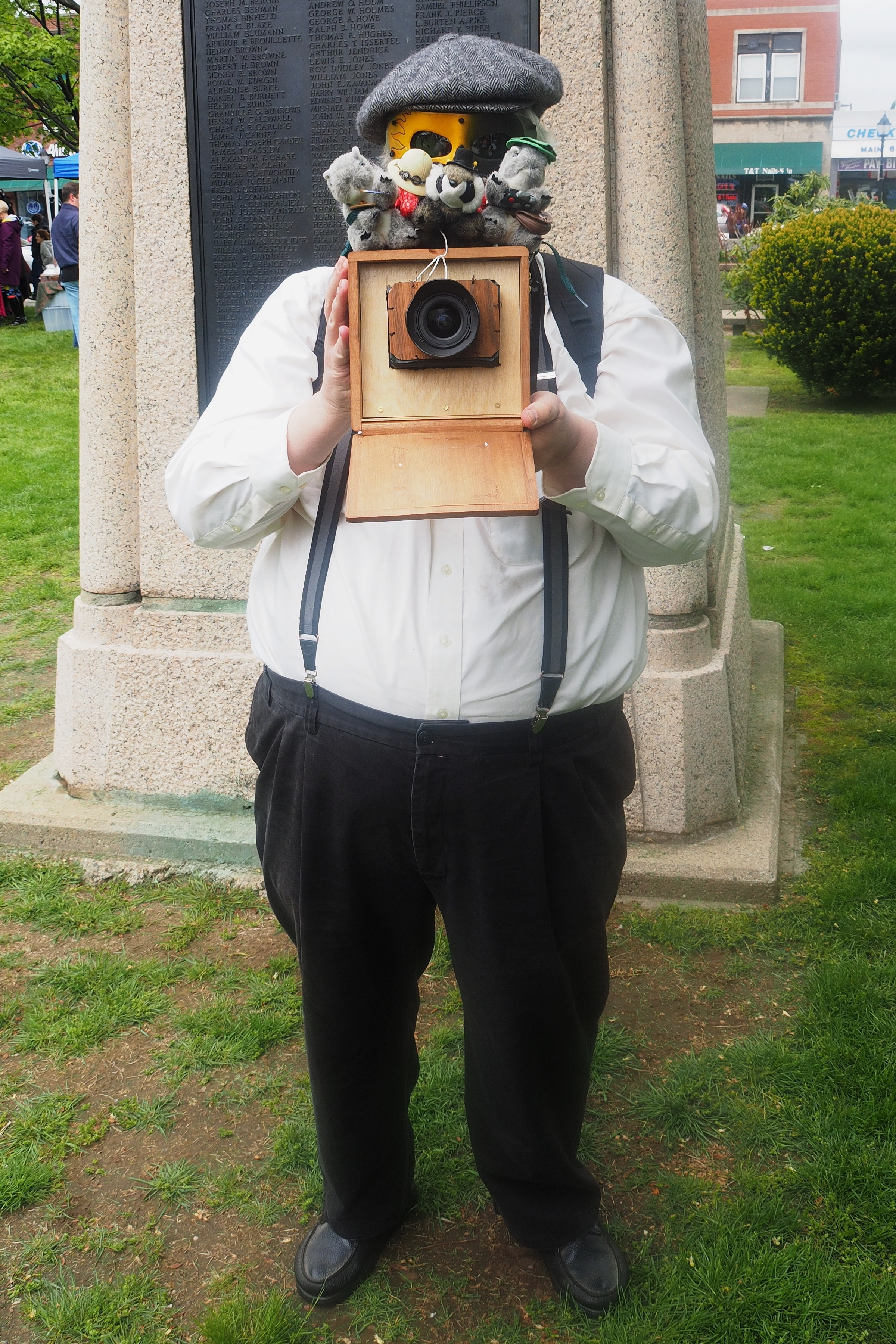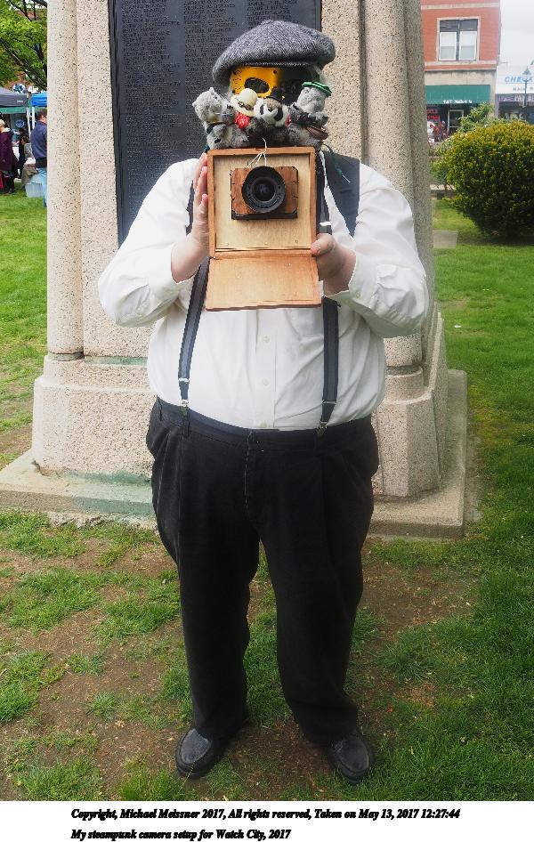 Picture #2: My steampunk camera setup for Watch City, 2017 #2 Thumb: 345x460, 46,592 bytes (46K) Small: 690x966, 127,632 bytes (125K), (html file) Large: 3450x4600, 3,567,797 bytes (3.4M), (html file) Copyright, Michael Meissner 2017, All rights reserved Olympus E-M1-I camera with Olympus-m43 14-150mm-II f/4.0-5.6 lens f/7.1, ISO 200, 1/250 sec, 67.0mm, auto mode, vivid color, SHQ, matrix metering, bias -0.3, IS Auto, noise reduction auto, noise filter low, anti-shock 35mm equivalent focal length 134.0mm Programs used: crop, raw therapee, rotate right Taken by Michael Meissner on May 13, 2017 12:27:49 Last modified on April 25, 2018 at 10:48 The camera box was an Acid Cigar box. After the shots were taken, the front hinged lid (which was only held on by 2 nails) broke off. From left to right, my steampunk mascots are: