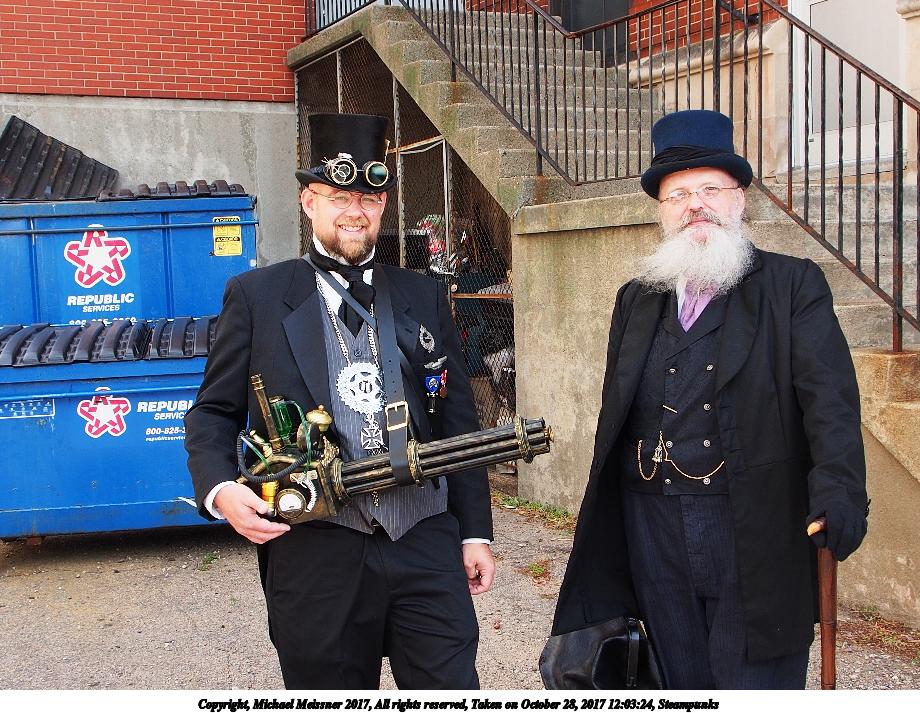 Picture #54: Steampunks #11 Thumb: 450x338, 47,717 bytes (47K) Small: 900x698, 128,715 bytes (126K), (html file) Large: 3600x2700, 1,814,436 bytes (1.7M), (html file) Copyright, Michael Meissner 2017, All rights reserved Olympus Stylus-1 camera f/3.2, ISO 100, 1/160 sec, 14.5mm, auto mode, vivid color, SHQ, matrix metering, IS Auto, noise reduction auto, noise filter low 35mm equivalent focal length 70.0mm Programs used: crop, raw therapee Taken by Michael Meissner on October 28, 2017 16:23:00 Last modified on April 25, 2018 at 10:12 |