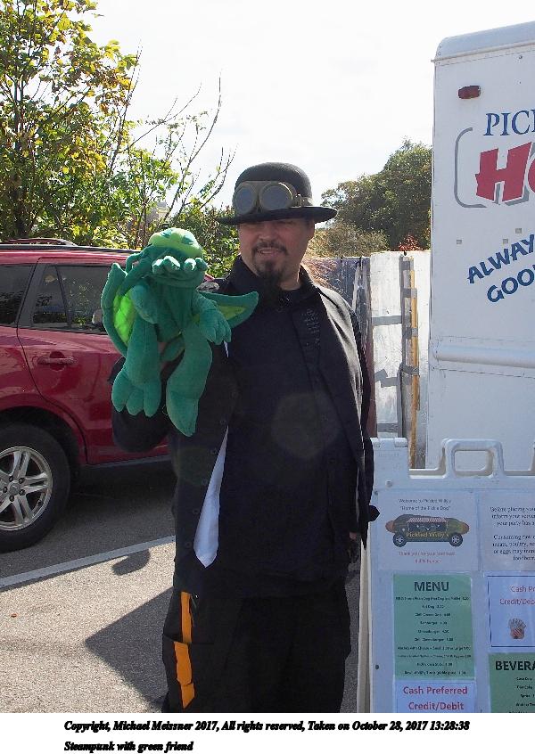 Picture #37: Steampunk with green friend Thumb: 360x480, 53,919 bytes (53K) Small: 600x846, 120,284 bytes (118K), (html file) Large: 1800x2400, 3,241,942 bytes (3.1M), (html file) Copyright, Michael Meissner 2017, All rights reserved Olympus E-M5-I camera with Olympus-m43 12-50mm f/3.5-6.3 lens f/8.0, ISO 200, 1/400 sec, 12.0mm, auto mode, vivid color, matrix metering, IS1 (All Direction Shake IS), noise filter low 35mm equivalent focal length 24.0mm Programs used: crop, gimp, raw therapee Taken by Michael Meissner on October 28, 2017 13:28:38 Last modified on April 25, 2018 at 10:11 |