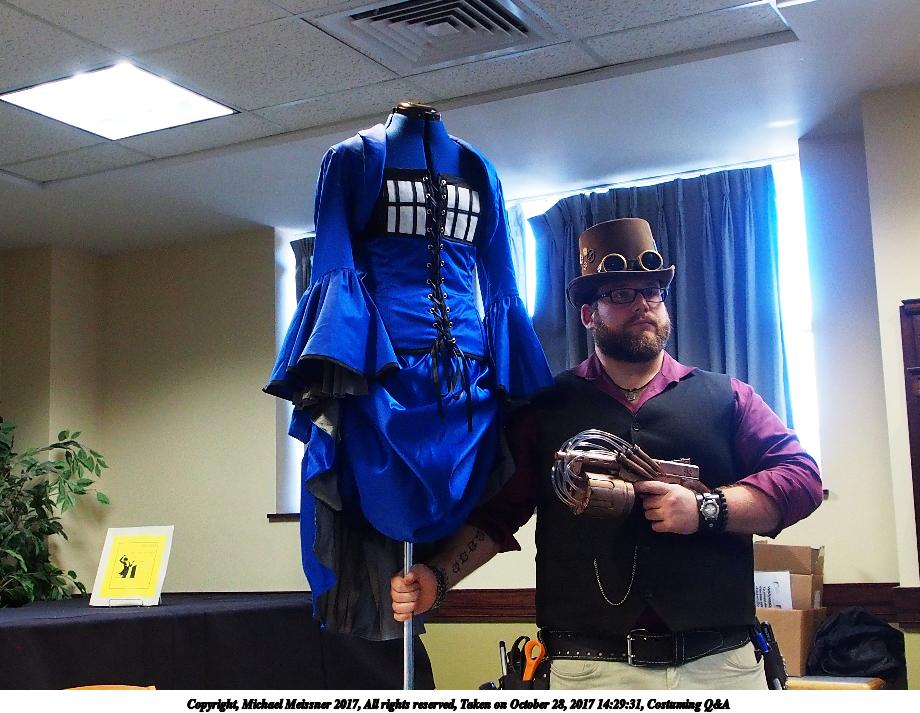 Picture #39: Costuming Q&A Thumb: 460x345, 45,443 bytes (45K) Small: 920x713, 119,417 bytes (117K), (html file) Large: 4600x3450, 2,882,083 bytes (2.7M), (html file) Copyright, Michael Meissner 2017, All rights reserved Olympus E-M5-I camera with Olympus-m43 12-50mm f/3.5-6.3 lens f/3.5, ISO 1600, 1/60 sec, 12.0mm, auto mode, vivid color, matrix metering, digital zoom x2, IS1 (All Direction Shake IS), noise filter low 35mm equivalent focal length 48.0mm, digital zoom x2 Programs used: crop, raw therapee Taken by Michael Meissner on October 28, 2017 14:29:31 Last modified on April 25, 2018 at 10:11 |
