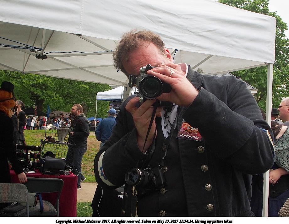 Picture #62: Photographing the photographer Thumb: 480x480, 75,610 bytes (74K) Small: 800x823, 172,389 bytes (169K), (html file) Large: 2400x2400, 4,815,053 bytes (4.6M), (html file) Copyright, Michael Meissner 2017, All rights reserved Olympus E-M1-I camera with Olympus-m43 14-150mm-II f/4.0-5.6 lens f/5.0, ISO 200, 1/100 sec, 16.0mm, auto mode, vivid color, SHQ, matrix metering, IS Auto, noise reduction auto, noise filter low, anti-shock 35mm equivalent focal length 32.0mm Programs used: crop, gimp, raw therapee Taken by Michael Meissner on May 13, 2017 12:23:01 Last modified on April 27, 2018 at 23:11 |