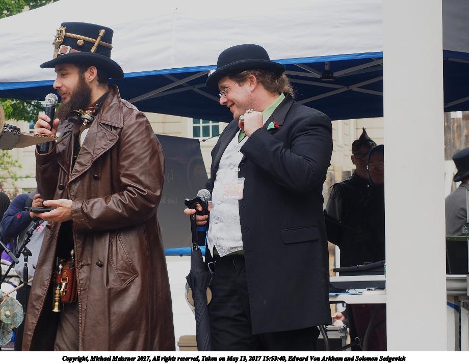 Picture #171: Edward Von Arkham and Solomon Sedgewick Thumb: 460x345, 46,579 bytes (46K) Small: 920x713, 106,371 bytes (104K), (html file) Large: 4600x3450, 1,947,863 bytes (1.9M), (html file) Copyright, Michael Meissner 2017, All rights reserved Olympus E-M1-I camera with Olympus-m43 12-40mm f/2.8 lens f/5.6, ISO 200, 1/250 sec, 40.0mm, auto mode, vivid color, SHQ, matrix metering, digital zoom x2, IS Auto, noise filter low, anti-shock 35mm equivalent focal length 160.0mm, digital zoom x2 Programs used: crop, raw therapee Taken by Michael Meissner on May 13, 2017 15:53:40 Last modified on April 27, 2018 at 23:17 |