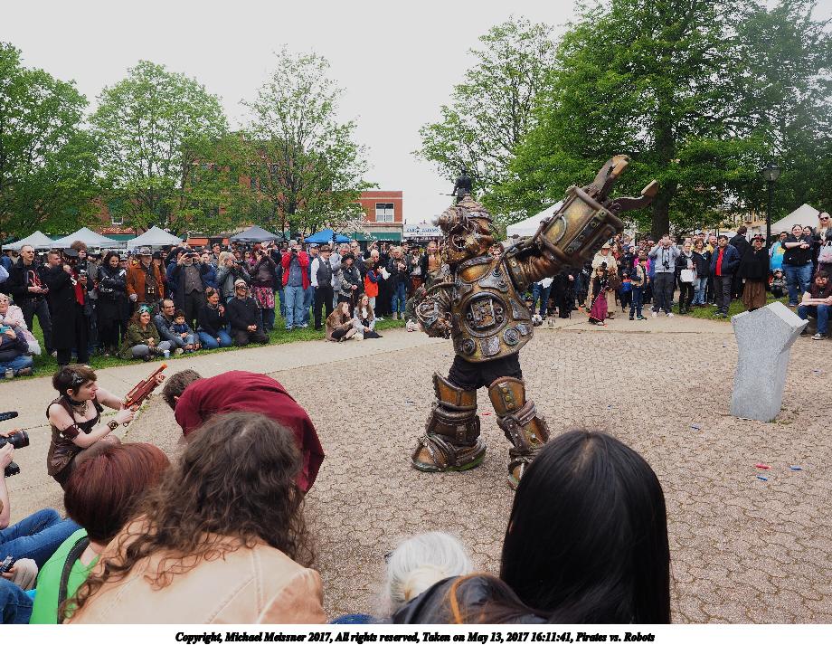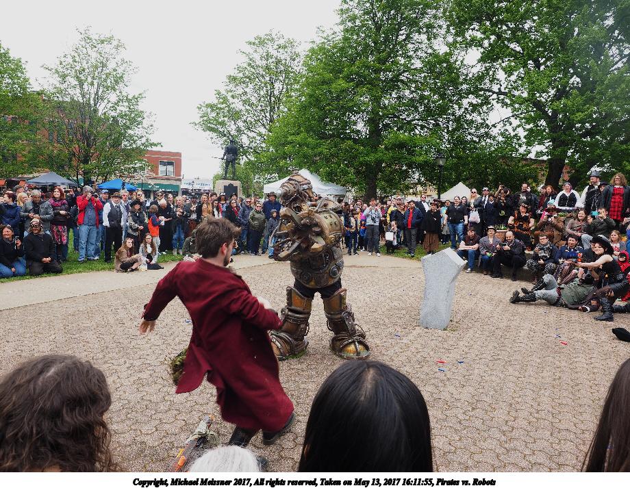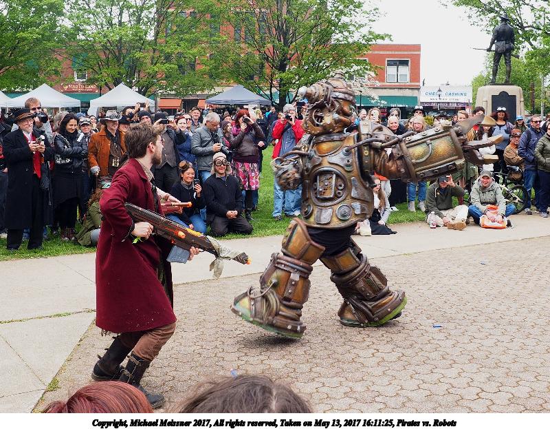 Picture #186: Pirates vs. Robots Thumb: 480x360, 79,353 bytes (78K) Small: 800x623, 178,526 bytes (175K), (html file) Large: 2400x1800, 4,311,279 bytes (4.1M), (html file) Copyright, Michael Meissner 2017, All rights reserved Olympus E-M1-I camera with Olympus-m43 12-40mm f/2.8 lens f/5.6, ISO 200, 1/250 sec, 12.0mm, auto mode, vivid color, SHQ, matrix metering, IS Auto, noise filter low, anti-shock 35mm equivalent focal length 24.0mm Programs used: crop, gimp, raw therapee Taken by Michael Meissner on May 13, 2017 16:11:25 Last modified on April 27, 2018 at 23:18 |