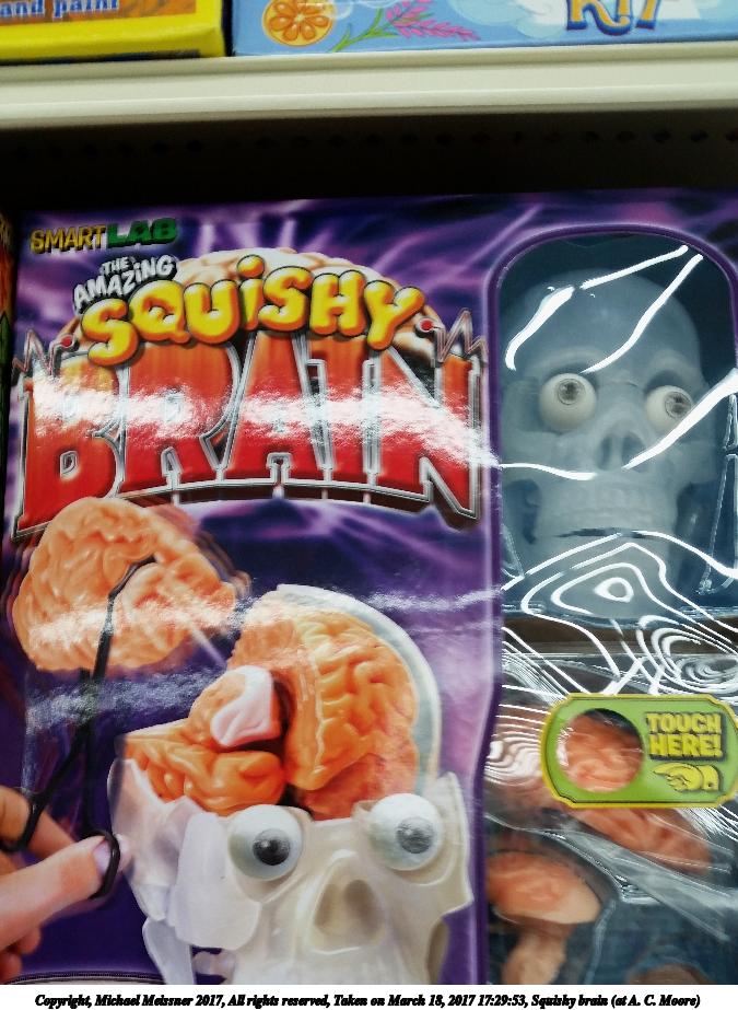 Picture #2: Squishy brain (at A. C. Moore) 675x923, 115,620 bytes (113K), (html file) Copyright, Michael Meissner 2017, All rights reserved Samsung S5 phone f/2.2, ISO 50, 1/30 sec, 4.8mm, auto mode, center weight metering 35mm equivalent focal length 31.0mm Programs used: crop, rawtherapee, rotate right Taken by Michael Meissner on March 18, 2017 17:29:53 Last modified on April 28, 2018 at 10:42 |