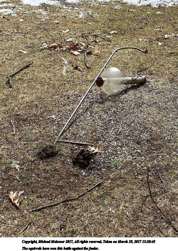 Picture #1: The squirrels have won this battle against the feeder. 600x846, 263,188 bytes (258K), (html file) Copyright, Michael Meissner 2017, All rights reserved Samsung S5 phone f/2.2, ISO 40, 1/908 sec, 4.8mm, auto mode, center weight metering 35mm equivalent focal length 31.0mm Programs used: crop, gimp, rotate Taken by Michael Meissner on March 29, 2017 13:28:43 Last modified on April 28, 2018 at 10:42 |