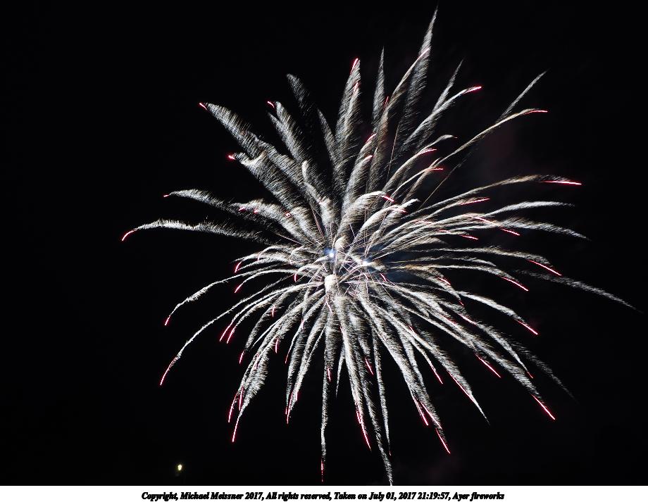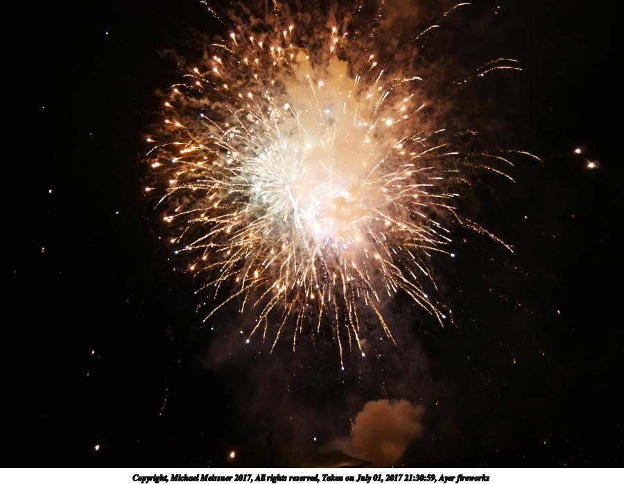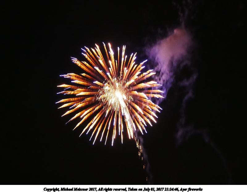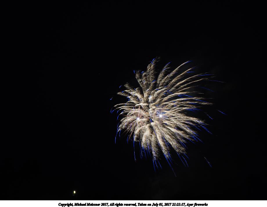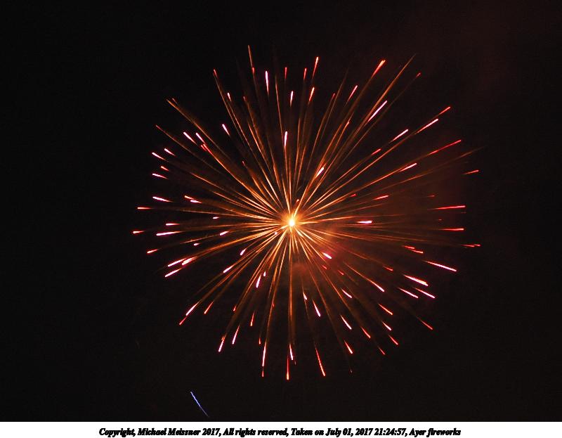 Picture #61: Ayer fireworks #10 1000x690, 91,773 bytes (90K), (html file) Copyright, Michael Meissner 2017, All rights reserved Olympus E-M1-I camera with Olympus-m43 12-40mm f/2.8 lens f/5.6, ISO 200, 8 sec, 12.0mm, manual mode, vivid color, SHQ, center weight metering, manual focus, noise reduction auto, noise filter low, live time/bulb, right eye priority 35mm equivalent focal length 24.0mm Programs used: crop, gimp Taken by Michael Meissner on July 01, 2017 21:25:11 Last modified on April 27, 2018 at 11:00 |