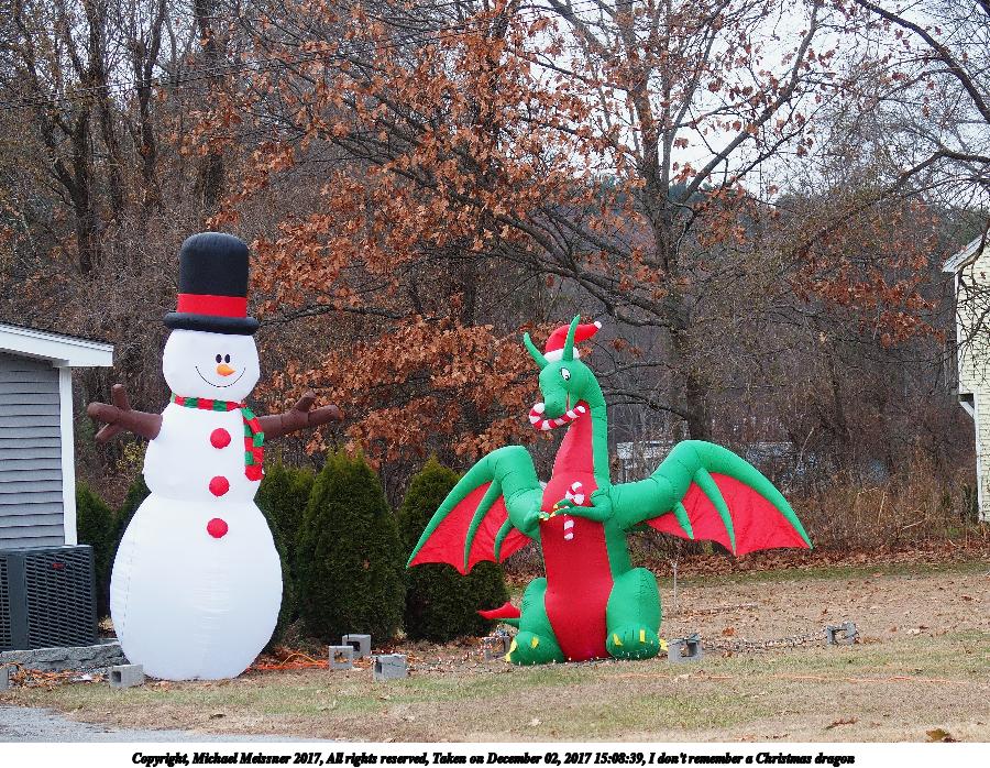 Picture #1: I don't remember a Christmas dragon Thumb: 450x338, 65,508 bytes (64K) Small: 900x698, 253,048 bytes (248K), (html file) Copyright, Michael Meissner 2017, All rights reserved Olympus Stylus-1 camera f/2.8, ISO 200, 1/200 sec, 26.2mm, auto mode, vivid color, SHQ, spot metering, IS Auto, noise reduction auto, noise filter low 35mm equivalent focal length 124.0mm Programs used: crop, raw therapee Taken by Michael Meissner on December 02, 2017 15:08:39 Last modified on April 25, 2018 at 10:02 |