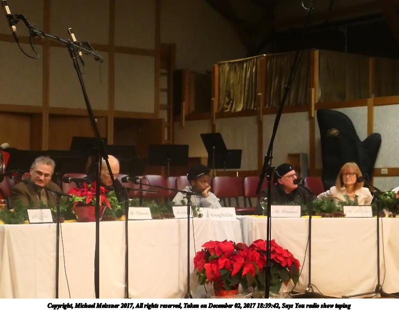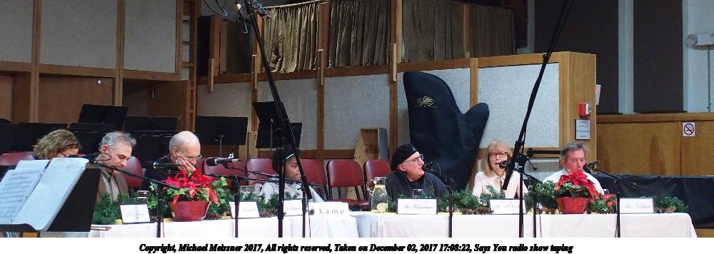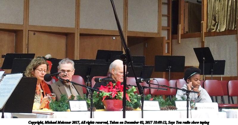 Picture #7: Says You radio show taping #7 Thumb: 450x338, 41,519 bytes (41K) Small: 900x698, 101,961 bytes (100K), (html file) Copyright, Michael Meissner 2017, All rights reserved Olympus Stylus-1 camera f/2.8, ISO 800, 1/60 sec, 35.0mm, auto mode, vivid color, SHQ, spot metering, IS Auto, noise reduction auto, noise filter low 35mm equivalent focal length 165.0mm Programs used: crop Taken by Michael Meissner on December 02, 2017 18:09:54 Last modified on April 25, 2018 at 10:04 |