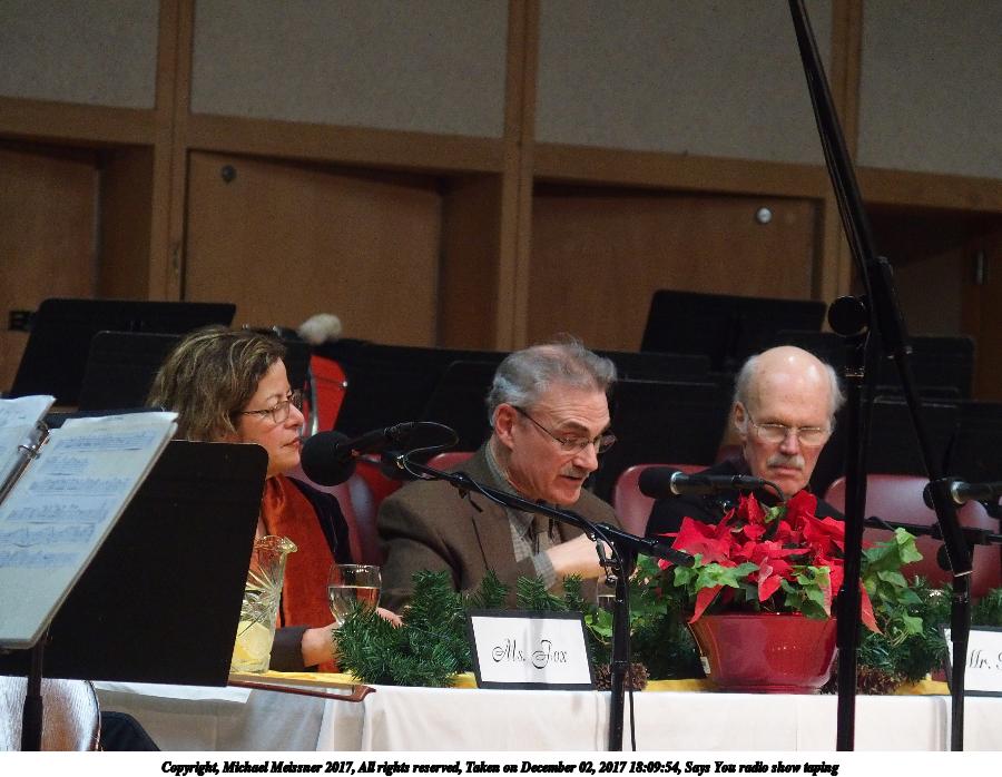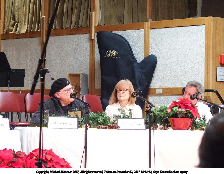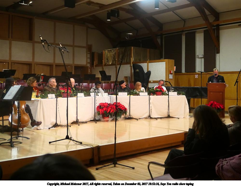 Picture #11: Says You radio show taping #11 Thumb: 500x333, 57,438 bytes (57K) Small: 1000x690, 145,241 bytes (142K), (html file) Copyright, Michael Meissner 2017, All rights reserved Olympus Stylus-1 camera f/2.8, ISO 800, 1/25 sec, 10.8mm, auto mode, vivid color, SHQ, spot metering, IS Auto, noise reduction auto, noise filter low 35mm equivalent focal length 50.0mm Programs used: crop, gimp Taken by Michael Meissner on December 02, 2017 18:52:35 Last modified on April 25, 2018 at 10:04 |