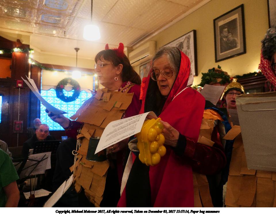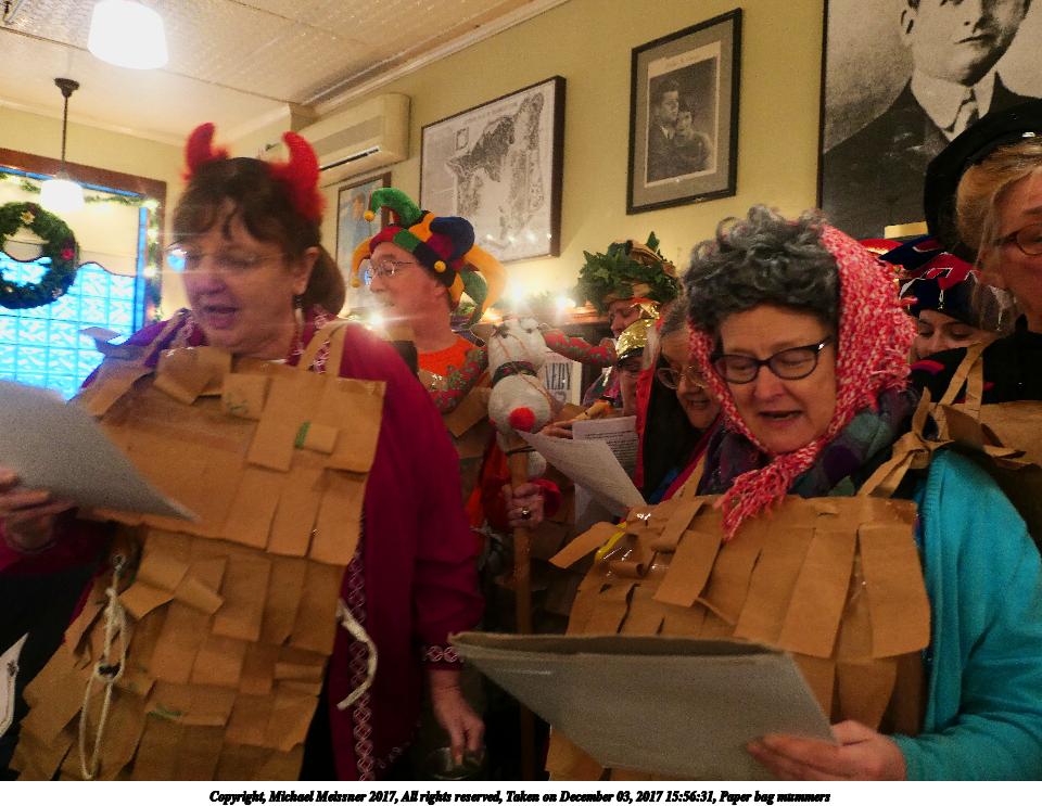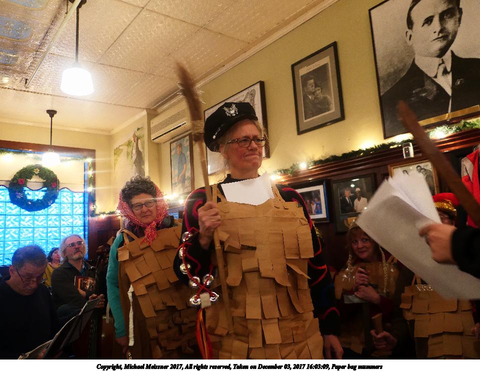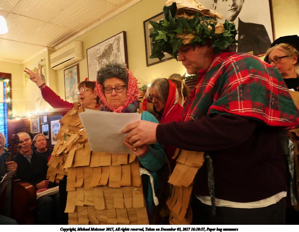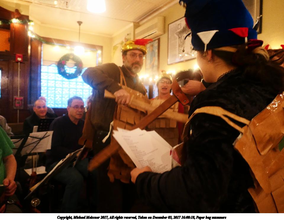 Picture #9: Paper bag mummers #6 Thumb: 480x360, 62,409 bytes (61K) Small: 960x743, 111,740 bytes (110K), (html file) Copyright, Michael Meissner 2017, All rights reserved Panasonic LX-10 camera f/1.4, ISO 800, 1/60 sec, 8.8mm, auto mode, auto wb (3200), matrix metering, image stabilization 35mm equivalent focal length 26.0mm Programs used: crop, raw therapee Taken by Michael Meissner on December 03, 2017 16:00:18 Last modified on April 25, 2018 at 10:05 |