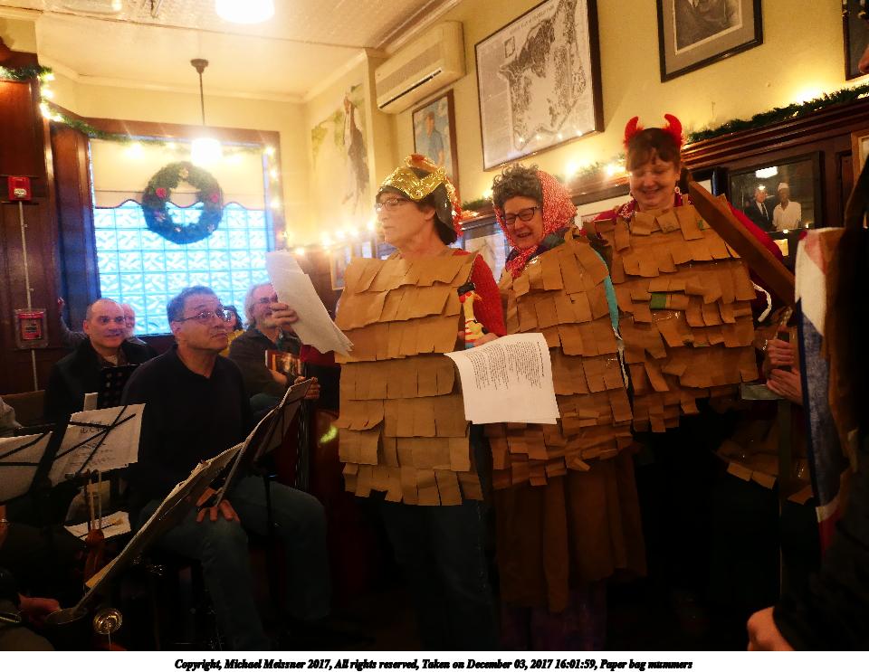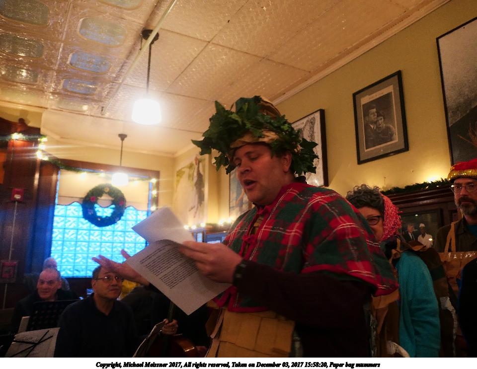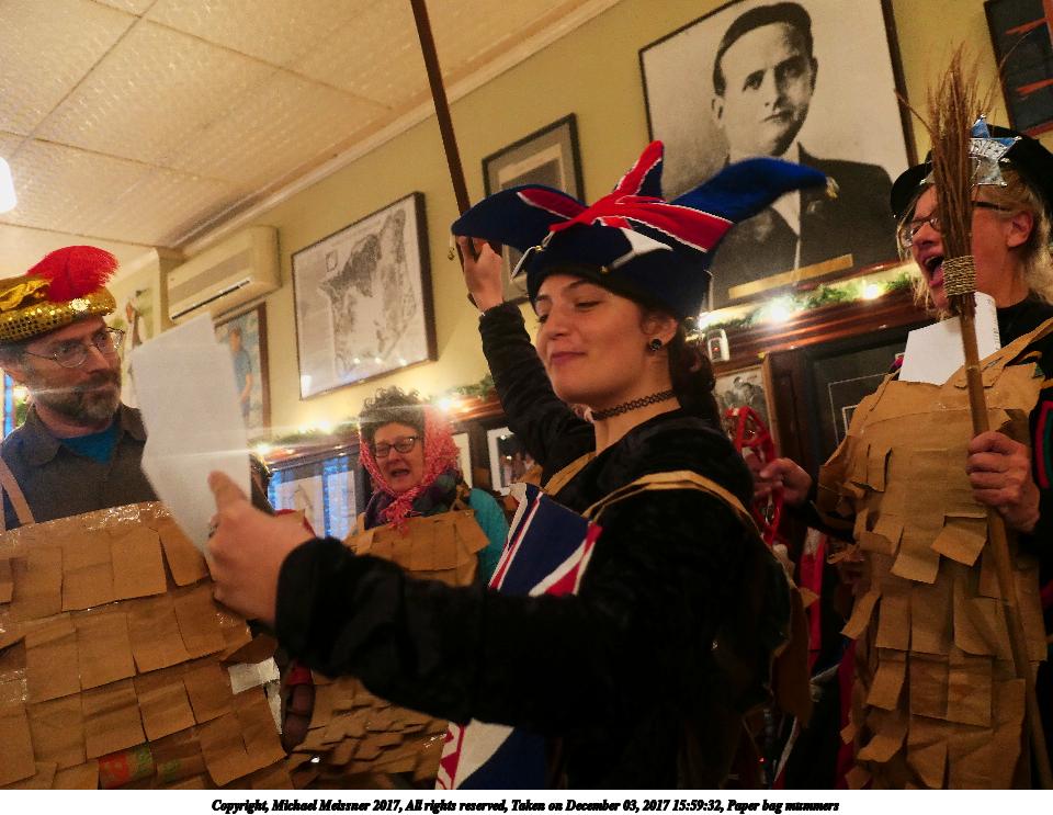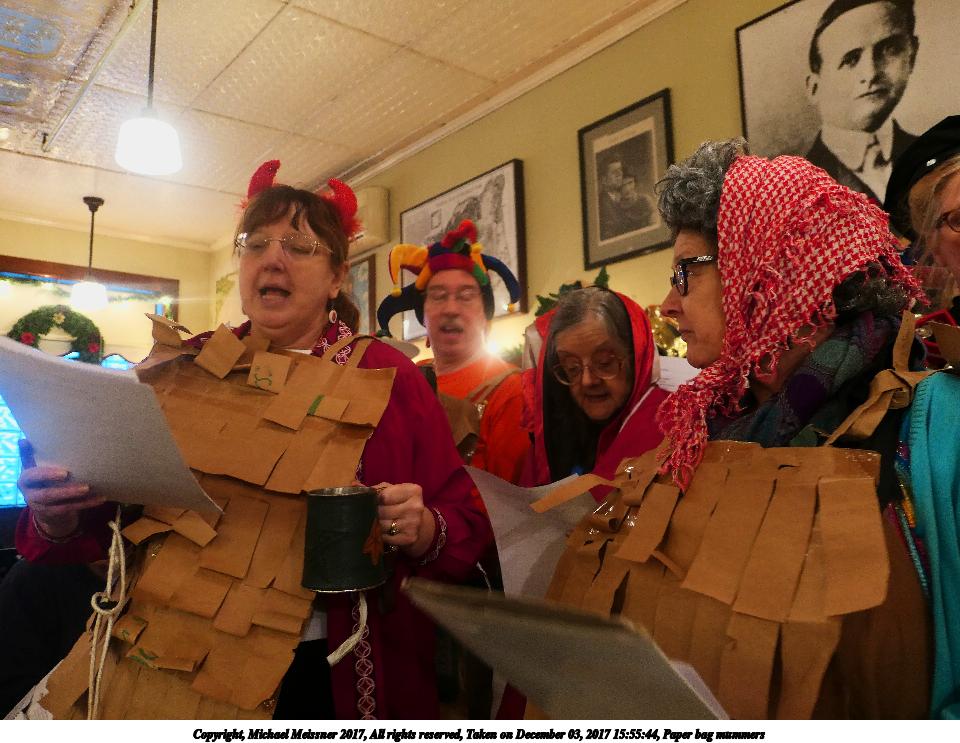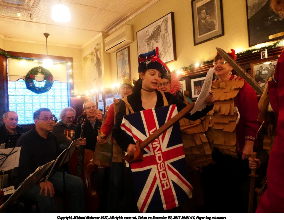 Picture #9: Paper bag mummers #6 Thumb: 480x360, 62,409 bytes (61K) Small: 960x743, 111,740 bytes (110K), (html file) Copyright, Michael Meissner 2017, All rights reserved Panasonic LX-10 camera f/1.4, ISO 800, 1/60 sec, 8.8mm, auto mode, auto wb (3200), matrix metering, image stabilization 35mm equivalent focal length 26.0mm Programs used: crop, raw therapee Taken by Michael Meissner on December 03, 2017 16:00:18 Last modified on April 25, 2018 at 10:05 |