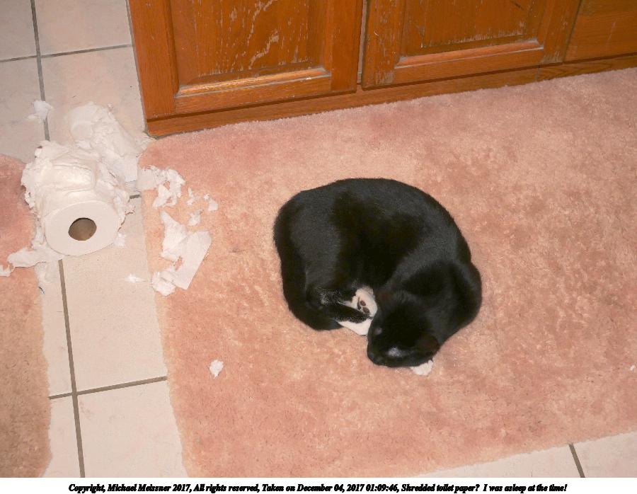 Picture #1: Shredded toilet paper? I was asleep at the time! Thumb: 450x338, 57,478 bytes (57K) Small: 900x698, 116,150 bytes (114K), (html file) Copyright, Michael Meissner 2017, All rights reserved Panasonic G85 camera with Panasonic 12-60mm f/3.5-5.6 lens f/4.7, ISO 800, flash, 1/60 sec, 28.0mm, auto mode, auto wb (5700), matrix metering 35mm equivalent focal length 56.0mm Programs used: gimp Taken by Michael Meissner on December 04, 2017 01:09:46 Last modified on April 25, 2018 at 10:04 |