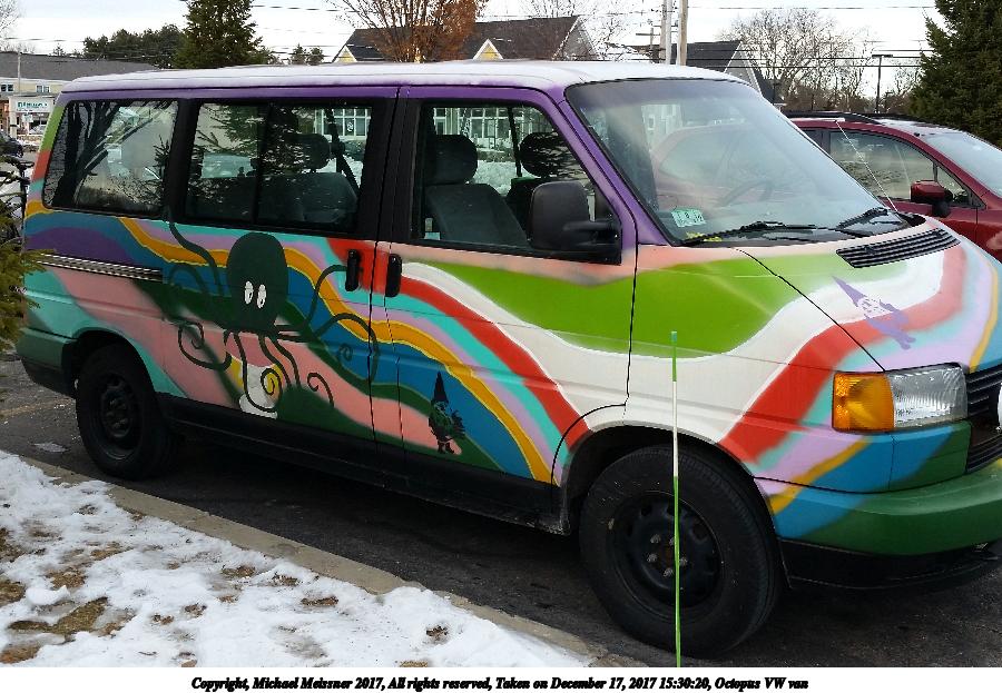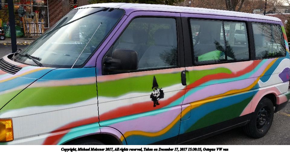Picture #1: Octopus VW van Thumb: 450x300, 41,927 bytes (41K) Small: 900x623, 123,814 bytes (121K), (html file) Copyright, Michael Meissner 2017, All rights reserved Samsung S5 phone f/2.2, ISO 64, flash, 1/120 sec, 4.8mm, auto mode, center weight metering 35mm equivalent focal length 31.0mm Programs used: gimp Taken by Michael Meissner on December 17, 2017 15:30:20 Last modified on April 25, 2018 at 10:07 |