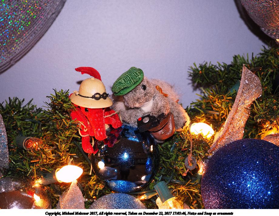 Picture #11: Nutzo and Snap as ornaments #3 Thumb: 460x345, 54,291 bytes (54K) Small: 920x713, 214,433 bytes (210K), (html file) Copyright, Michael Meissner 2017, All rights reserved Olympus E-M1-I camera with Olympus-m43 12-40mm f/2.8 lens f/2.8, ISO 1250, 1/60 sec, 19.0mm, auto mode, vivid color, SHQ, matrix metering, IS Auto, noise filter low, anti-shock 35mm equivalent focal length 38.0mm Programs used: adjusttime, crop, raw therapee Taken by Michael Meissner on December 22, 2017 17:03:59 Last modified on April 25, 2018 at 10:09 |