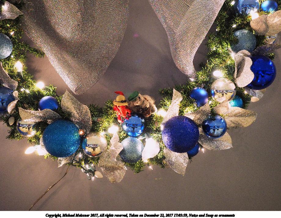 Picture #10: Nutzo and Snap as ornaments #2 Thumb: 460x345, 60,953 bytes (60K) Small: 920x713, 193,011 bytes (189K), (html file) Copyright, Michael Meissner 2017, All rights reserved Olympus E-M1-I camera with Olympus-m43 12-40mm f/2.8 lens f/2.8, ISO 200, flash (+0.33 flash compensation), 1/60 sec, 30.0mm, auto mode, vivid color, SHQ, flash (5500K), matrix metering, IS Auto, noise filter low, anti-shock 35mm equivalent focal length 60.0mm Programs used: adjusttime, crop, raw therapee Taken by Michael Meissner on December 22, 2017 17:03:46 Last modified on April 25, 2018 at 10:09 |