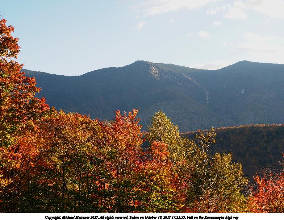 Picture #9: Fall on the Kancamagus highway 920x713, 181,509 bytes (178K), (html file) Copyright, Michael Meissner 2017, All rights reserved Olympus E-M1-I camera with Olympus-m43 14-150mm-II f/4.0-5.6 lens f/7.1, ISO 200, 1/160 sec, 36.0mm, auto mode, vivid color, SHQ, matrix metering, bias 0.3, IS Auto, noise filter low, anti-shock 35mm equivalent focal length 72.0mm Programs used: crop, gimp, raw therapee Taken by Michael Meissner on October 10, 2017 17:21:53 Last modified on April 25, 2018 at 10:51 The file originally appeared in http://www.the-meissners.org/2017-small-albums/2017-10/index.html. |