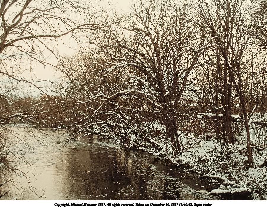 Picture #3: Sepia winter 900x698, 299,356 bytes (293K), (html file) Copyright, Michael Meissner 2017, All rights reserved Olympus Stylus-1 camera f/2.8, ISO 320, 1/50 sec, 9.8mm, auto mode, vivid color, SHQ, matrix metering, IS Auto, noise reduction auto, noise filter low 35mm equivalent focal length 46.0mm Programs used: crop, raw therapee Taken by Michael Meissner on December 10, 2017 16:16:43 Last modified on April 25, 2018 at 10:52 The file originally appeared in http://www.the-meissners.org/2017-small-albums/2017-12/index.html. |