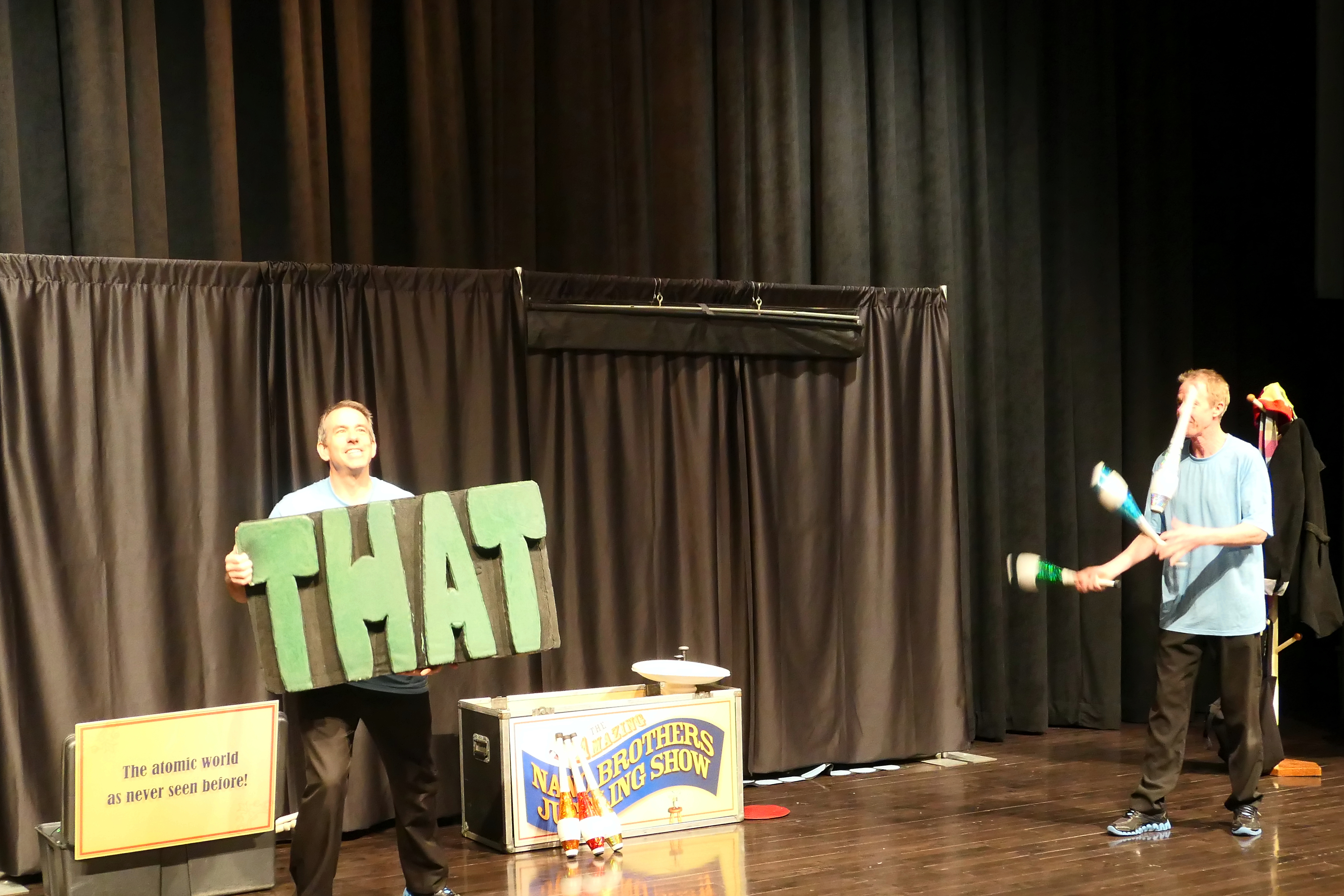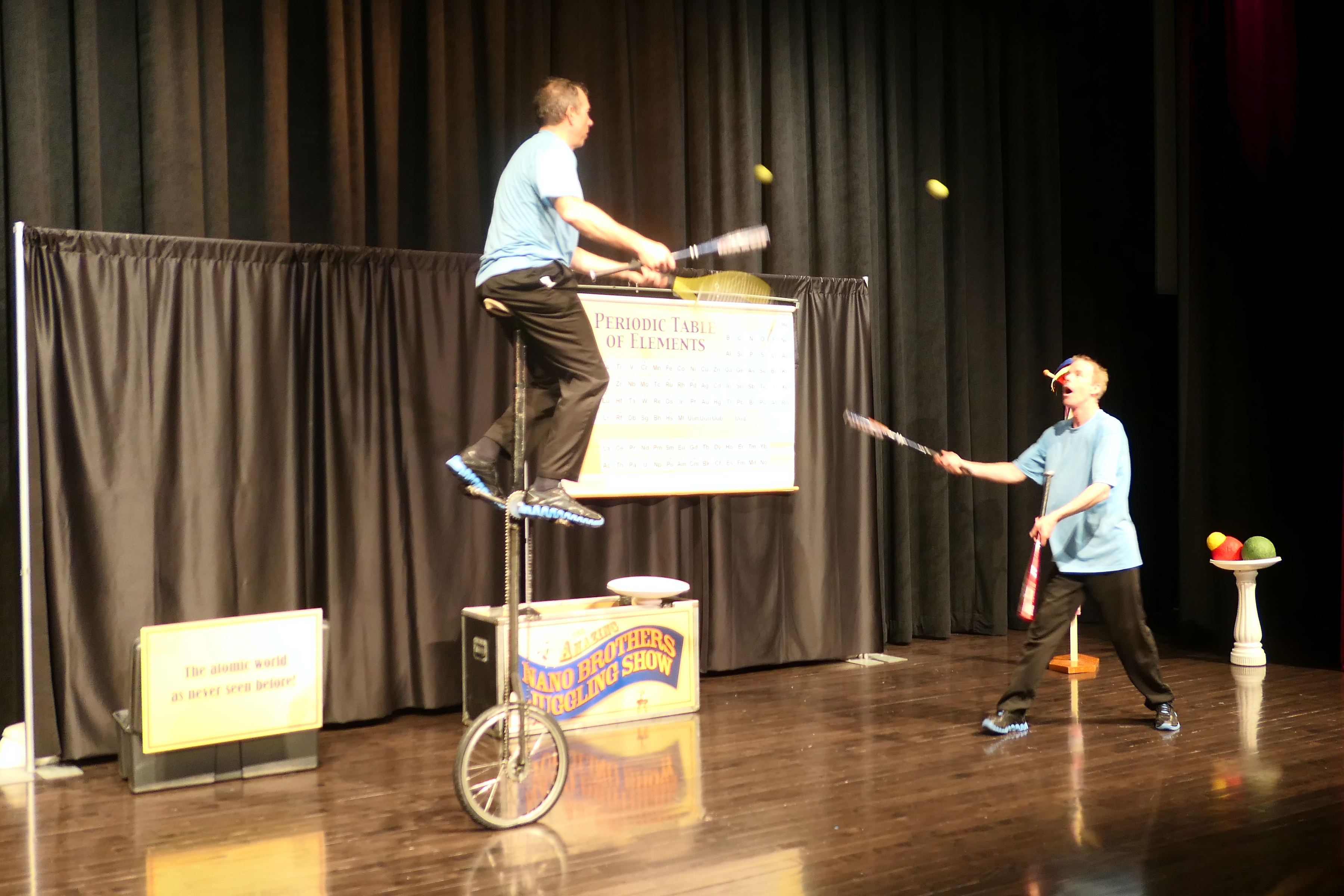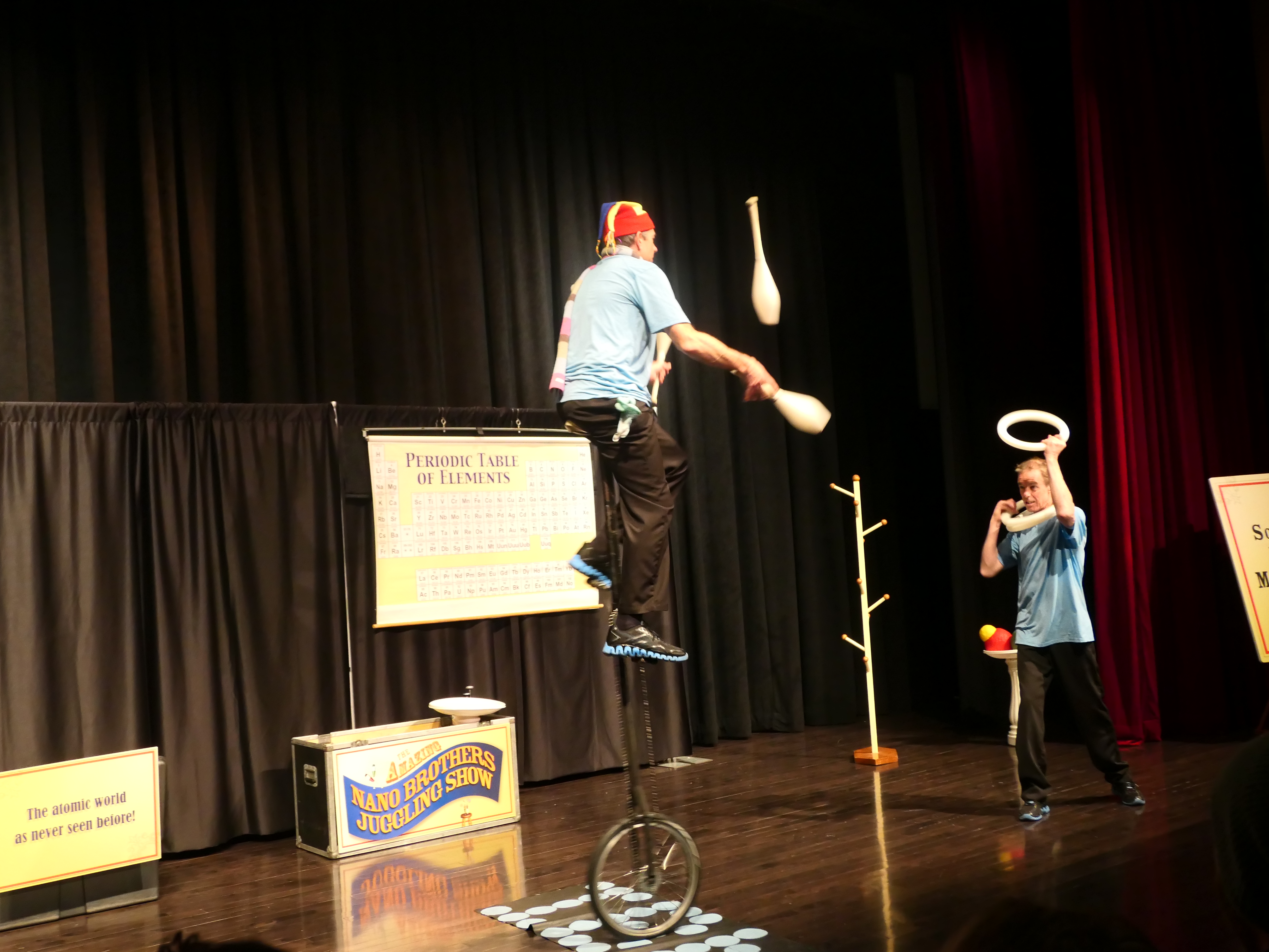 Picture #14: Nano brothers science juggling act #12 Thumb: 450x300, 61,529 bytes (61K) Small: 900x622, 110,085 bytes (108K), (html file) Large: 3600x2400, 4,852,051 bytes (4.6M), (html file) Copyright, Michael Meissner 2018, All rights reserved Panasonic LX-10 camera f/1.4, ISO 400, 1/60 sec, 8.8mm, auto mode, auto wb (3200), matrix metering, bias 0.3, image stabilization 35mm equivalent focal length 26.0mm Programs used: crop, gimp Taken by Michael Meissner on April 21, 2018 15:50:47 Last modified on May 13, 2018 at 23:36 |