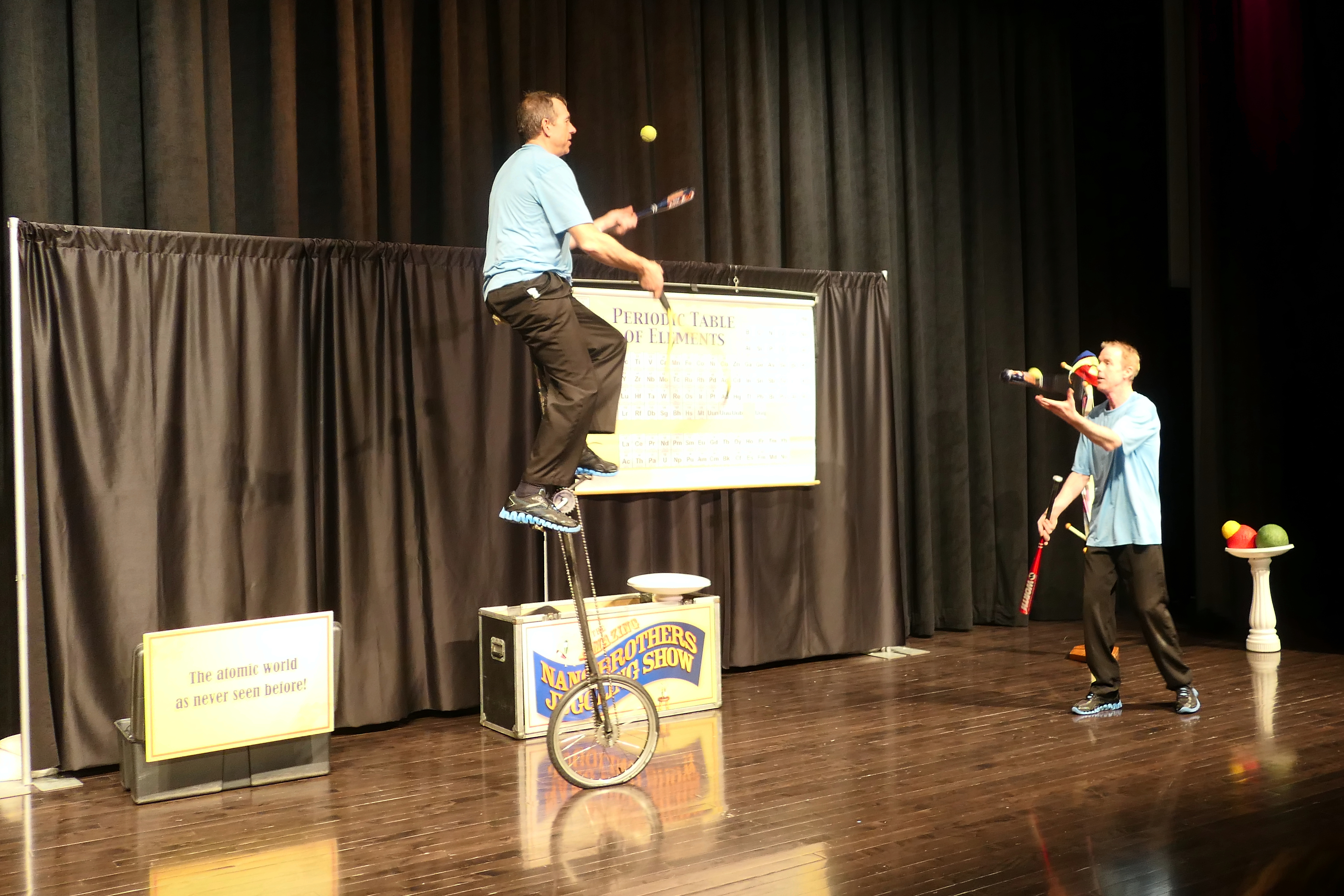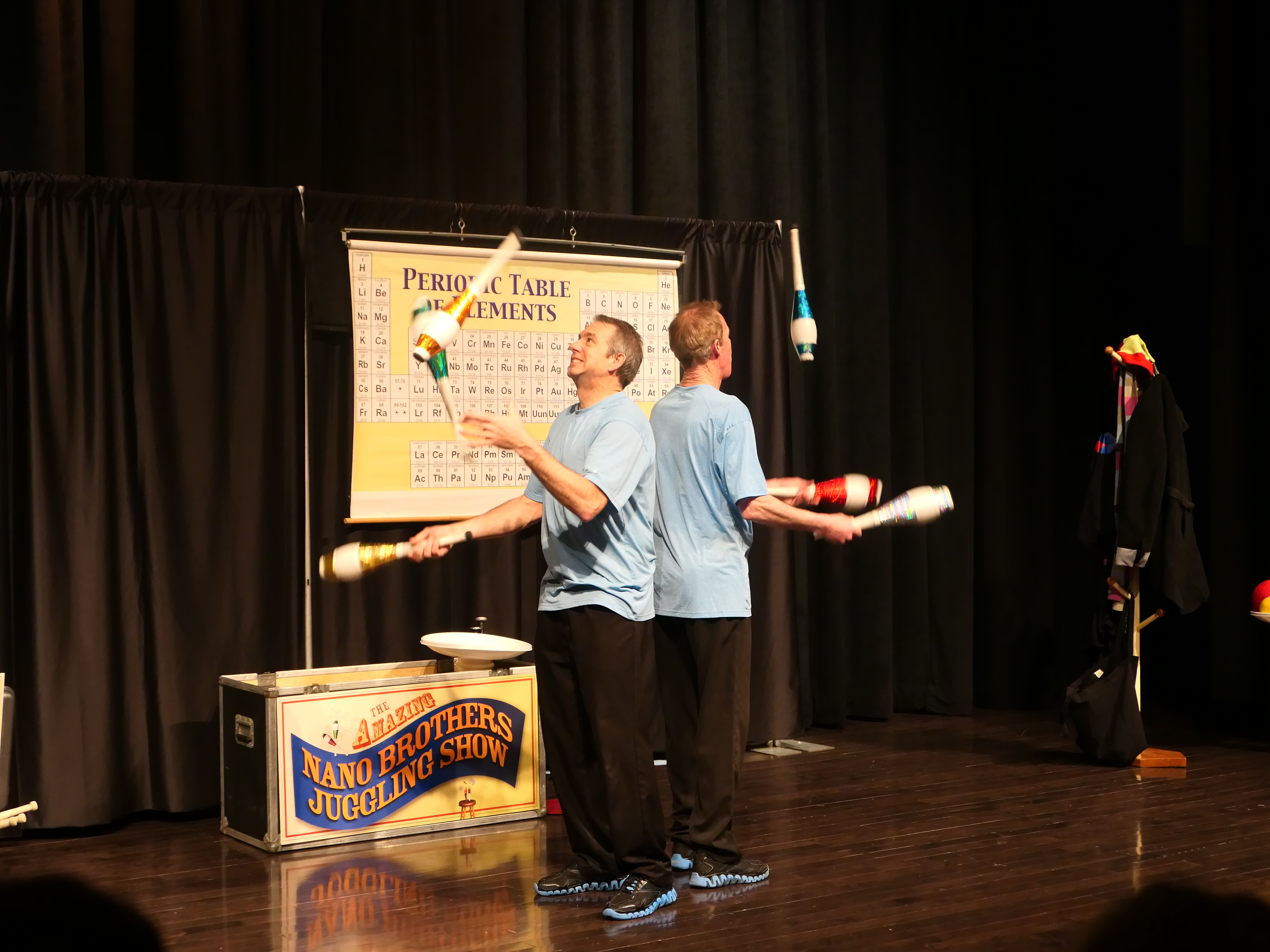 Picture #13: Nano brothers science juggling act #11 Thumb: 450x300, 60,233 bytes (59K) Small: 900x622, 107,560 bytes (106K), (html file) Large: 3600x2400, 4,599,239 bytes (4.4M), (html file) Copyright, Michael Meissner 2018, All rights reserved Panasonic LX-10 camera f/1.4, ISO 500, 1/60 sec, 8.8mm, auto mode, auto wb (3200), matrix metering, bias 0.3, image stabilization 35mm equivalent focal length 26.0mm Programs used: crop, gimp Taken by Michael Meissner on April 21, 2018 15:50:46 Last modified on May 13, 2018 at 23:35 |