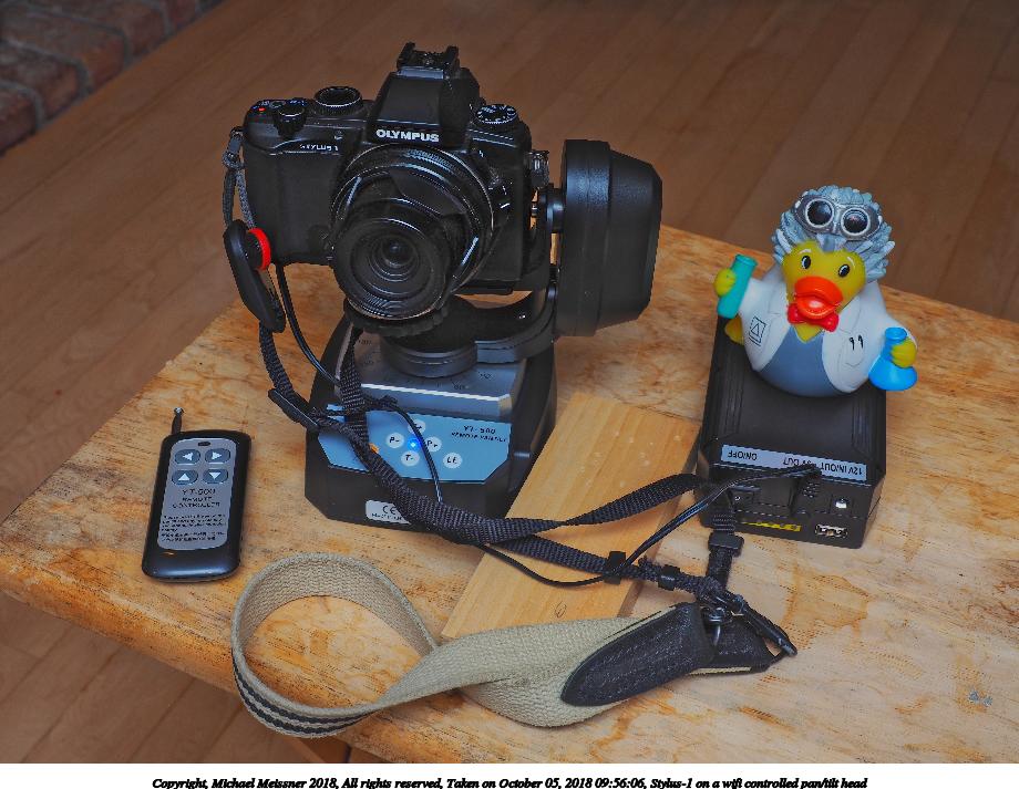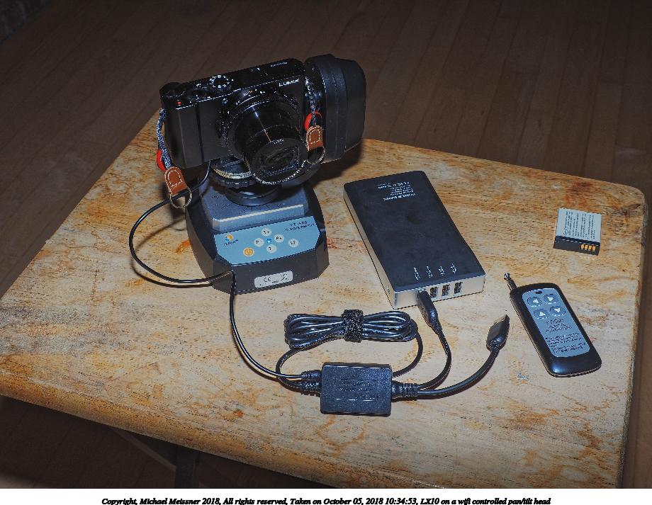Picture #8: LX10 on a wifi controlled pan/tilt head Small: 920x713, 133,020 bytes (130K), (html file) Large: 4600x3450, 3,588,490 bytes (3.4M), (html file) Copyright, Michael Meissner 2018, All rights reserved Olympus E-M10-II camera with Olympus-m43 12-40mm f/2.8 lens f/8.0, ISO 200, FL-36R flash, 1/60 sec, 24.0mm, aperture priority, vivid color, SHQ, matrix metering, IS Auto, noise reduction auto 35mm equivalent focal length 48.0mm Programs used: crop, raw therapee Taken by Michael Meissner on October 05, 2018 10:34:53 Last modified on October 05, 2018 at 11:46 |