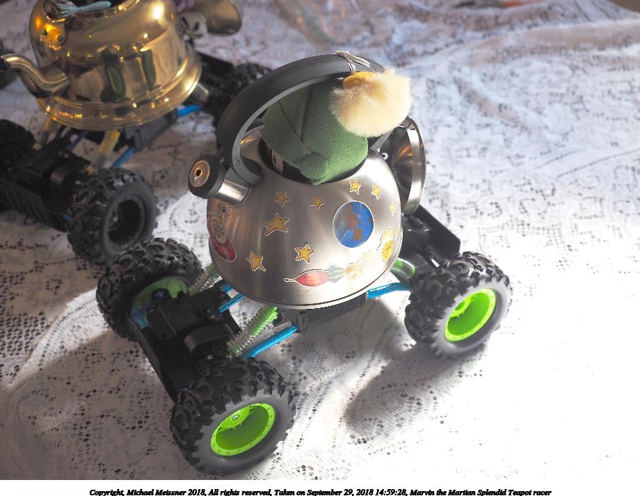 Picture #4: Marvin the Martian Splendid Teapot racer Small: 920x713, 110,751 bytes (109K), (html file) Large: 4600x3450, 6,167,931 bytes (5.9M), (html file) Copyright, Michael Meissner 2018, All rights reserved Olympus E-M10-II camera with Olympus-m43 12-40mm f/2.8 lens f/3.2, ISO 200, 1/80 sec, 27.0mm, auto mode, vivid color, SHQ, matrix metering, IS Auto, noise reduction auto 35mm equivalent focal length 54.0mm Programs used: crop, gimp, raw therapee Taken by Michael Meissner on September 29, 2018 14:59:28 Last modified on October 16, 2018 at 01:22 |