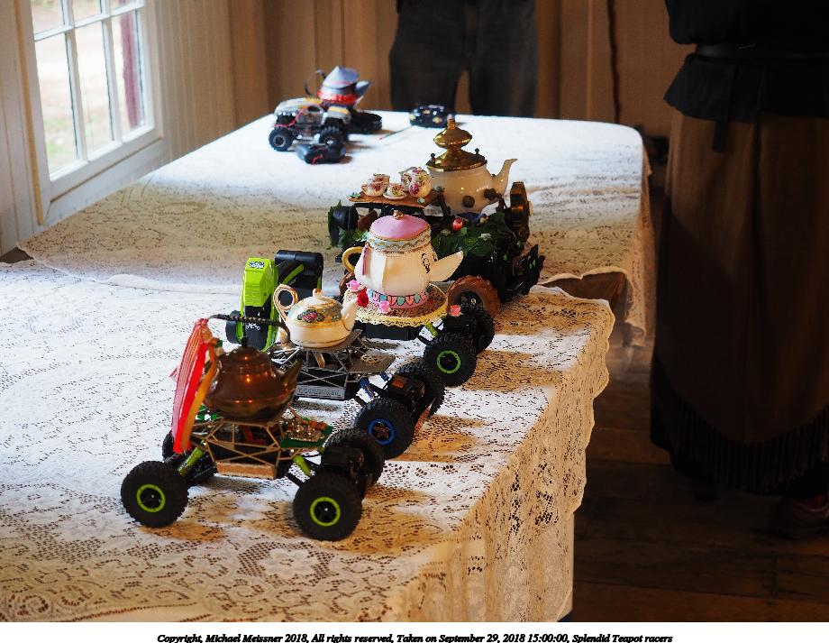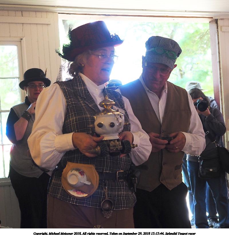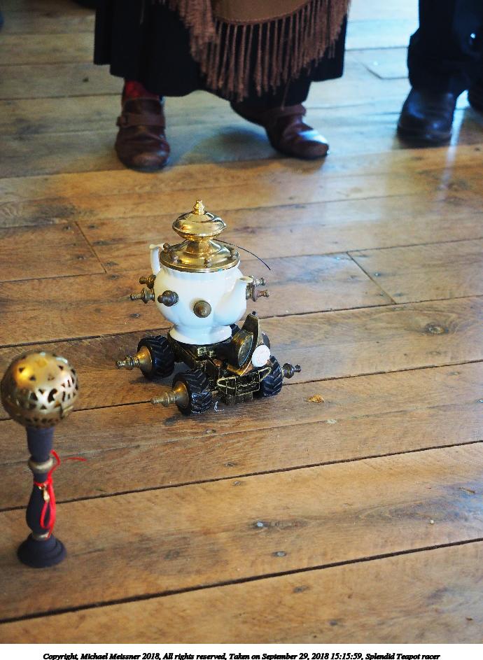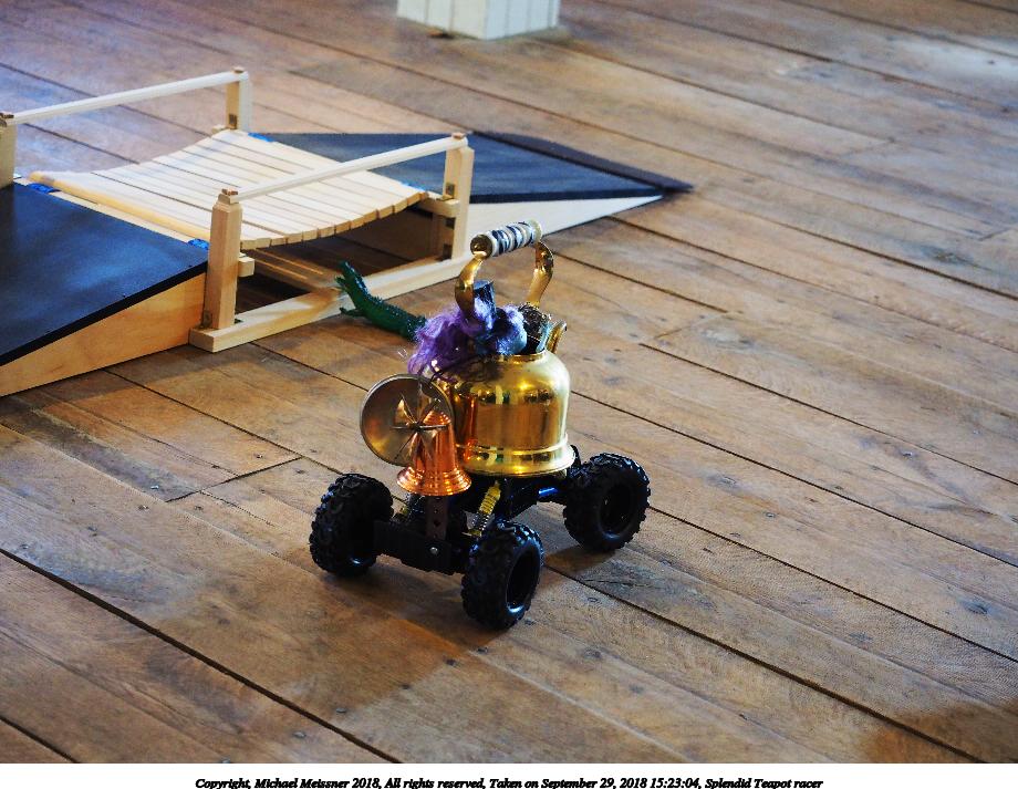 Picture #17: Splendid Teapot racer #5 Small: 690x943, 123,424 bytes (121K), (html file) Large: 3450x4600, 7,727,544 bytes (7.4M), (html file) Copyright, Michael Meissner 2018, All rights reserved Olympus E-M10-II camera with Olympus-m43 12-40mm f/2.8 lens f/2.8, ISO 640, 1/60 sec, 19.0mm, auto mode, vivid color, SHQ, matrix metering, IS Auto, noise reduction auto 35mm equivalent focal length 38.0mm Programs used: crop, gimp, raw therapee, rotate left Taken by Michael Meissner on September 29, 2018 15:22:23 Last modified on October 16, 2018 at 01:30 |