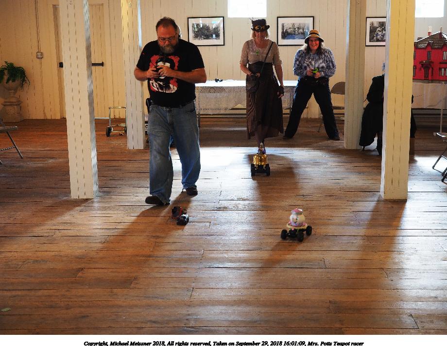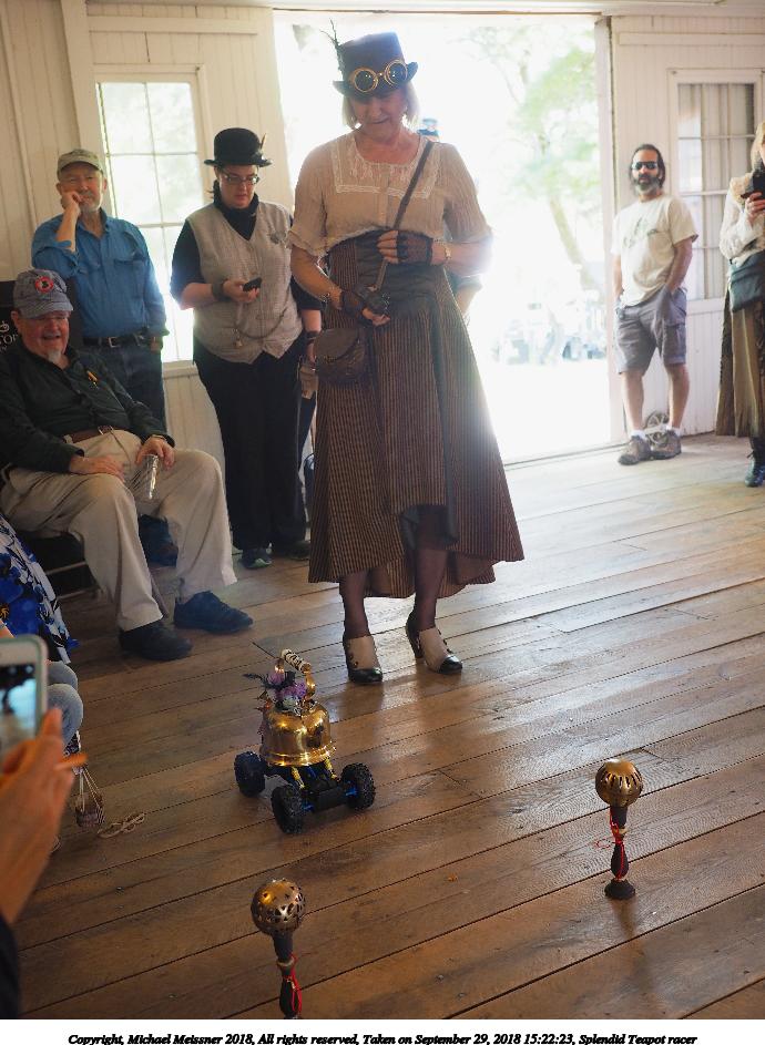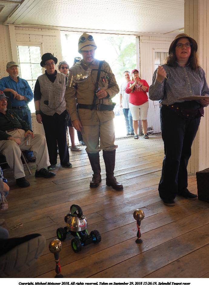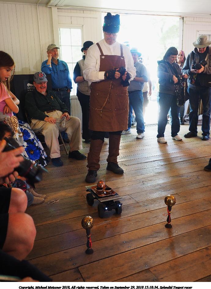 Picture #27: Smallest Teapot racer #4 Small: 920x713, 116,112 bytes (114K), (html file) Large: 4600x3450, 7,107,267 bytes (6.8M), (html file) Copyright, Michael Meissner 2018, All rights reserved Olympus E-M10-II camera with Olympus-m43 12-40mm f/2.8 lens f/2.8, ISO 800, 1/80 sec, 40.0mm, auto mode, vivid color, SHQ, matrix metering, IS Auto, noise reduction auto 35mm equivalent focal length 80.0mm Programs used: crop, gimp, raw therapee Taken by Michael Meissner on September 29, 2018 15:34:12 Last modified on October 16, 2018 at 01:40 |